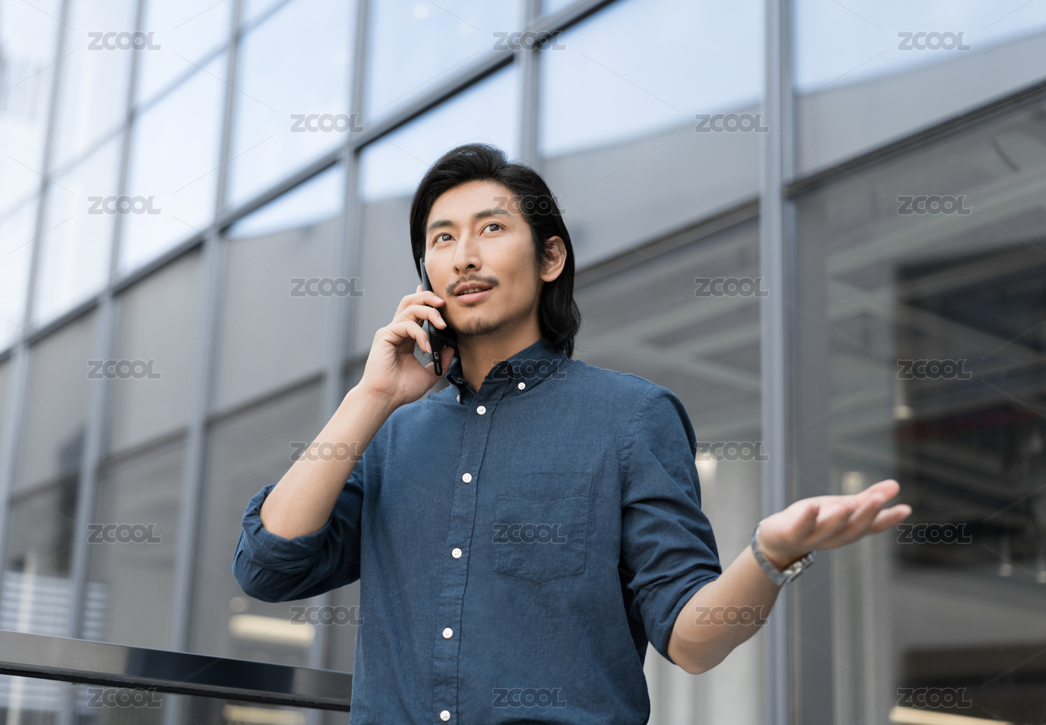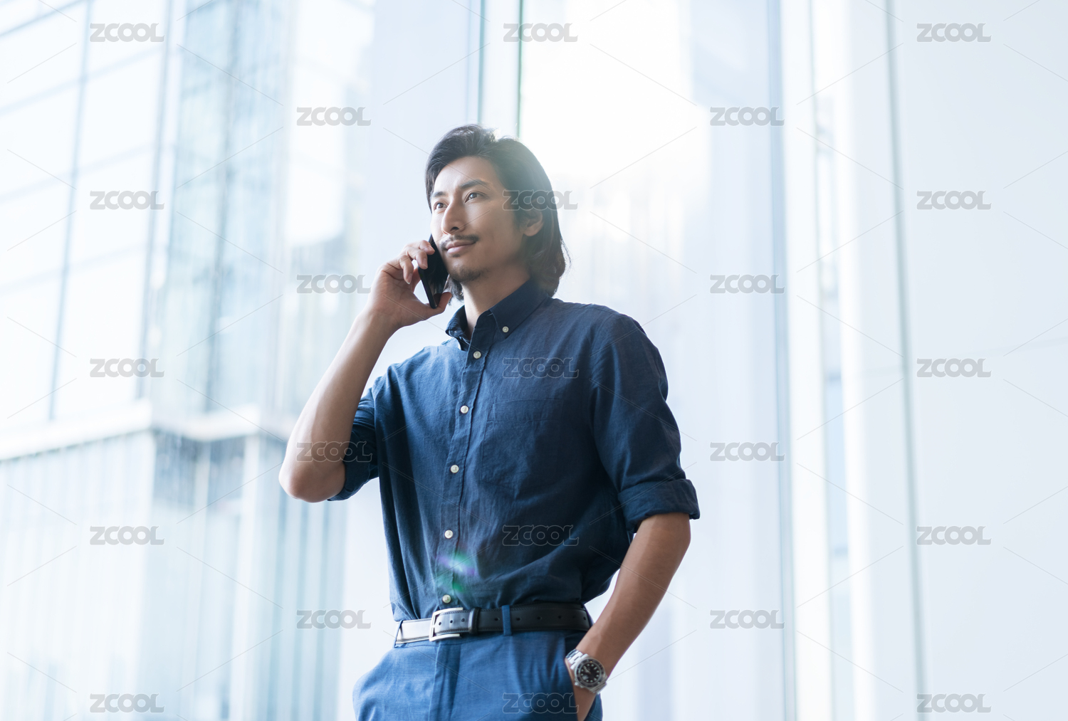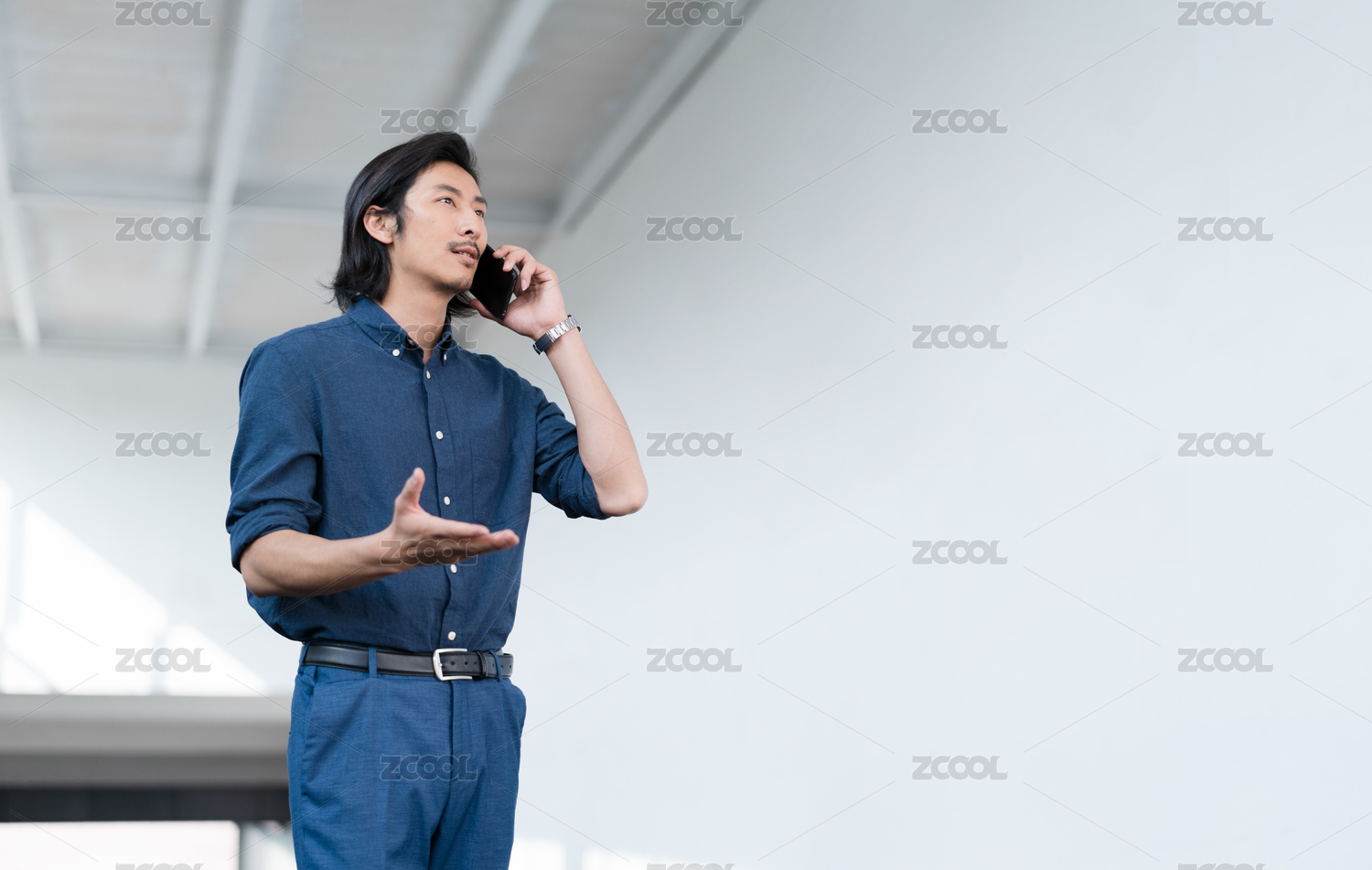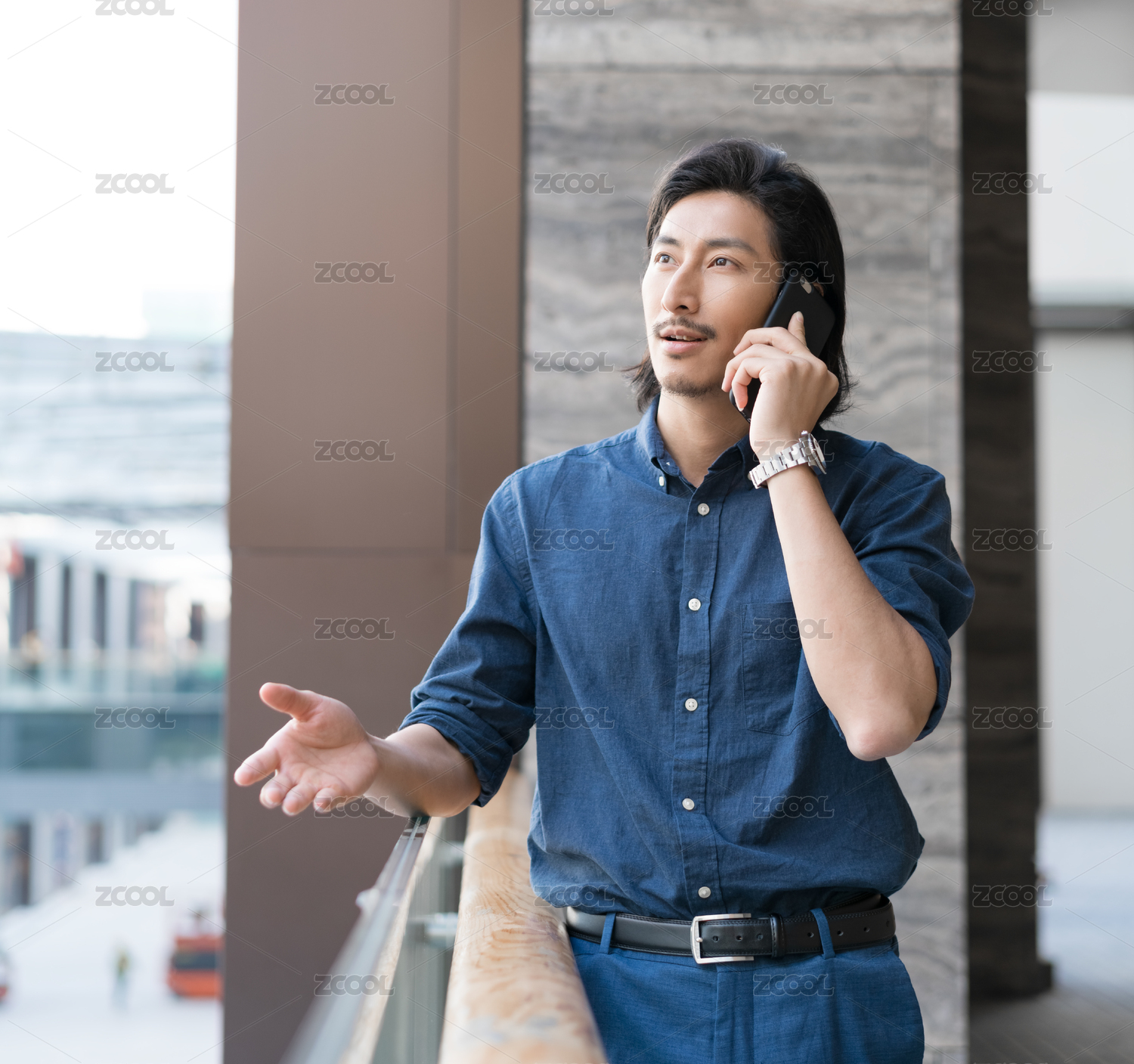 成熟的亚洲商务人士在写字楼的窗户边打电话