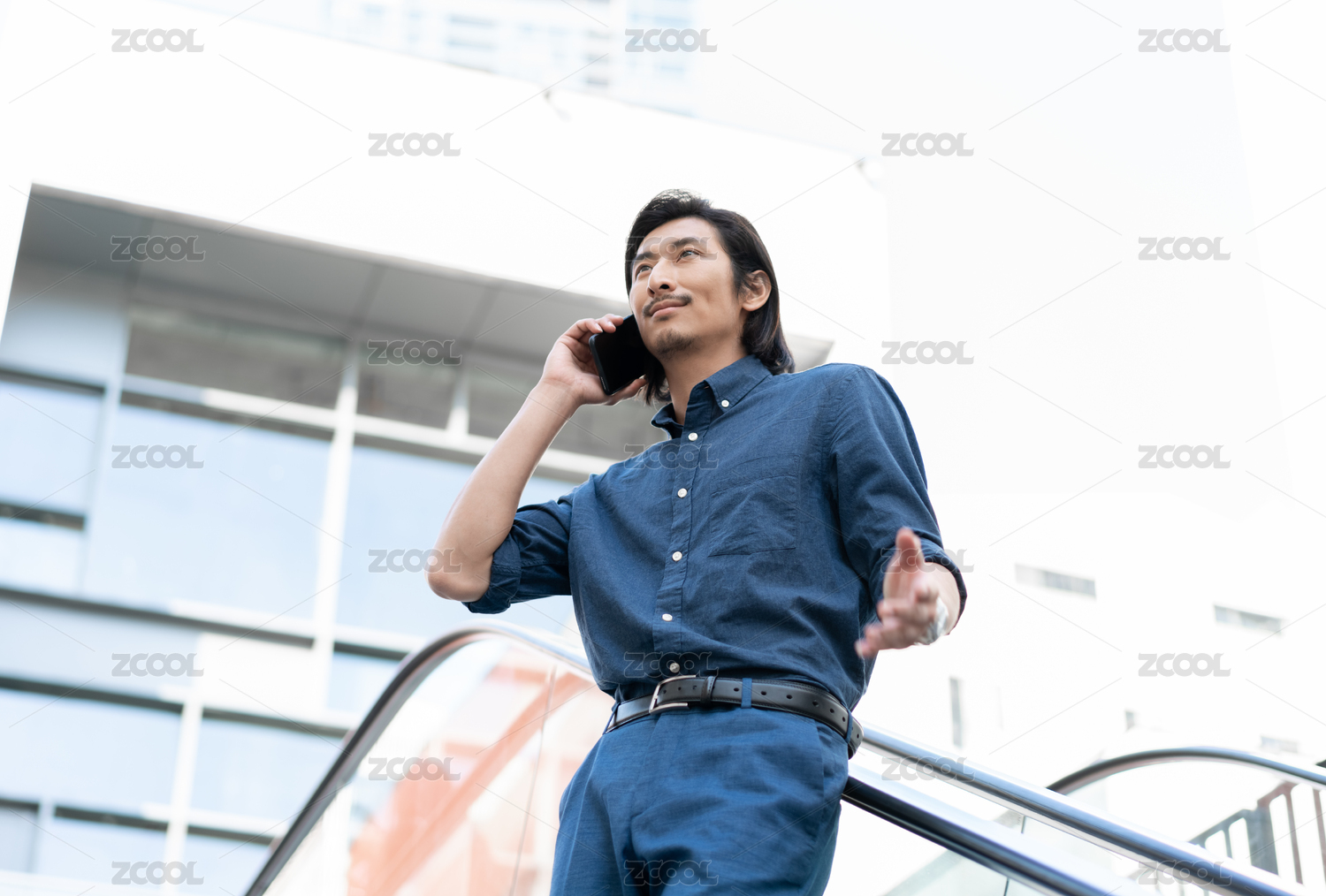 成熟自信的亚洲商务人士在自动扶梯上打电话