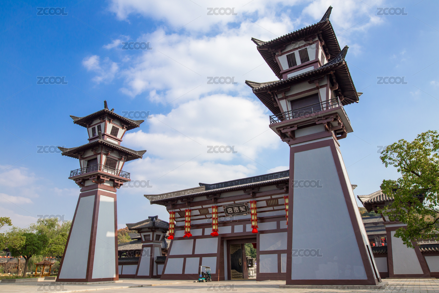 蓝天下的江苏省常州淹城旅游区入口牌坊