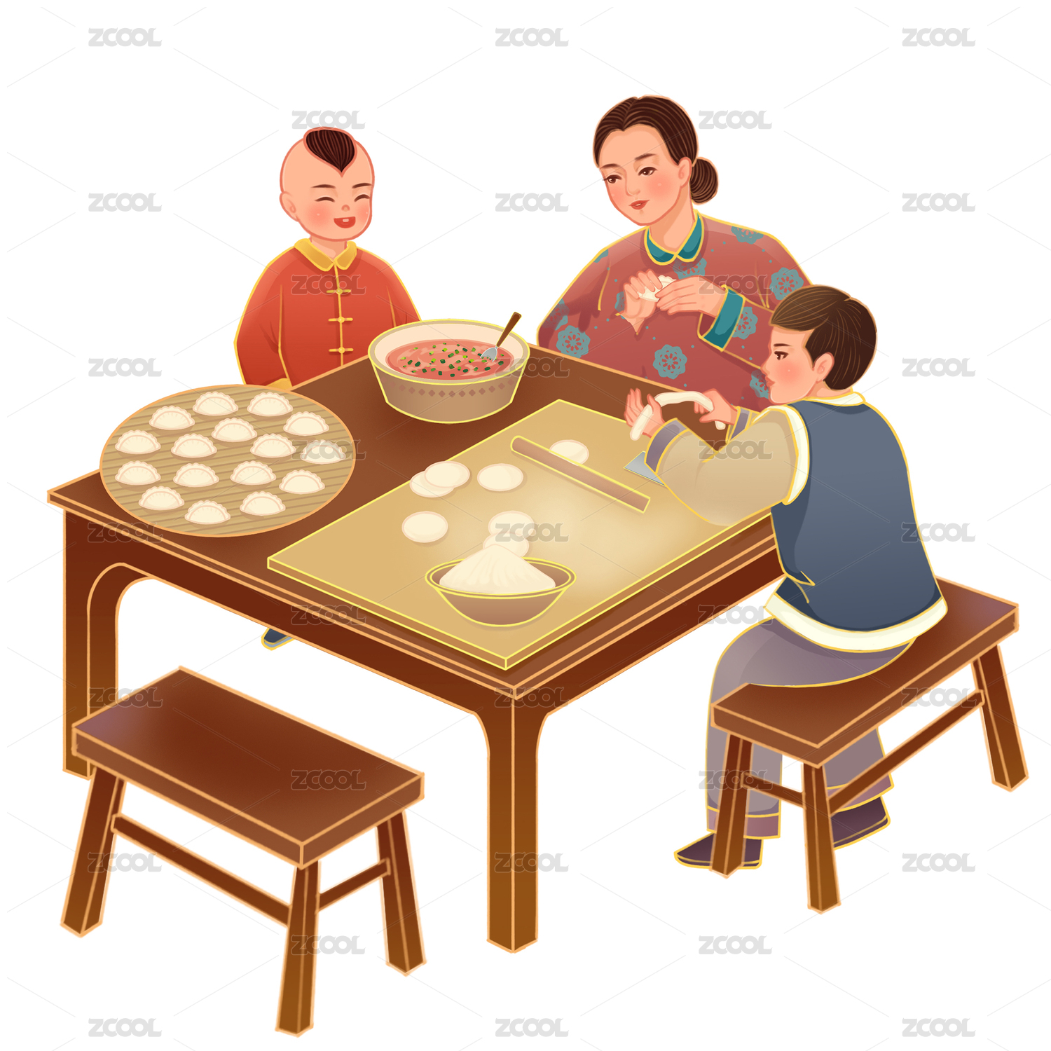 春节新年包饺子吃饺子的母女免抠人物元素