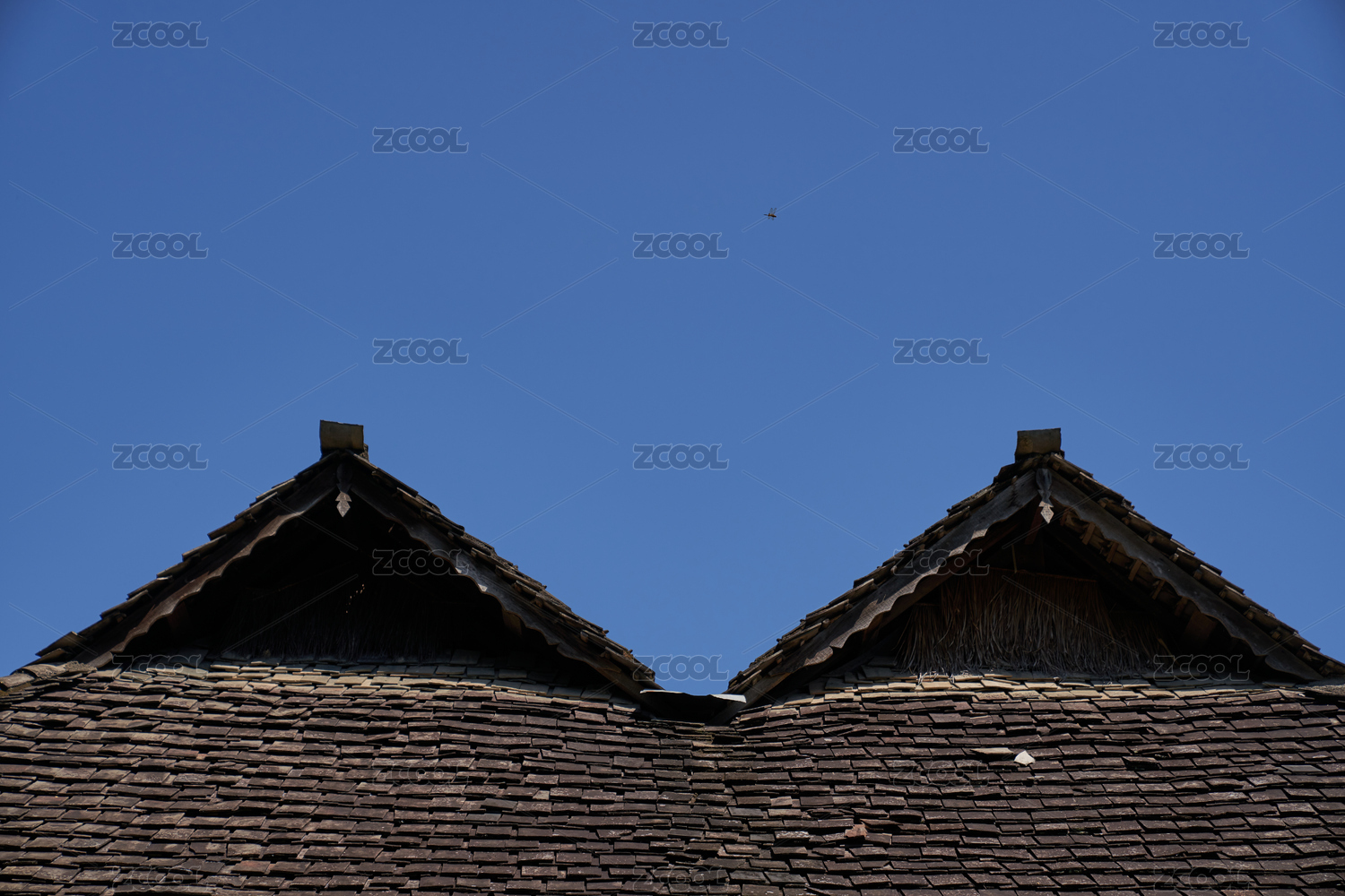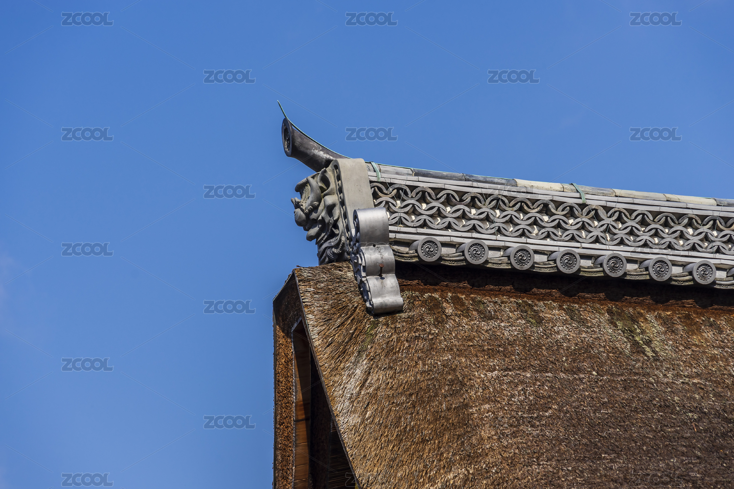 日本京都蓝天背景下清水寺寺庙草屋顶特写
