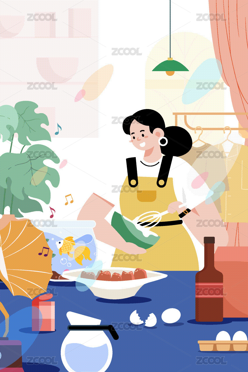 闪屏启动页引导页女孩种花旅行做蛋糕插画