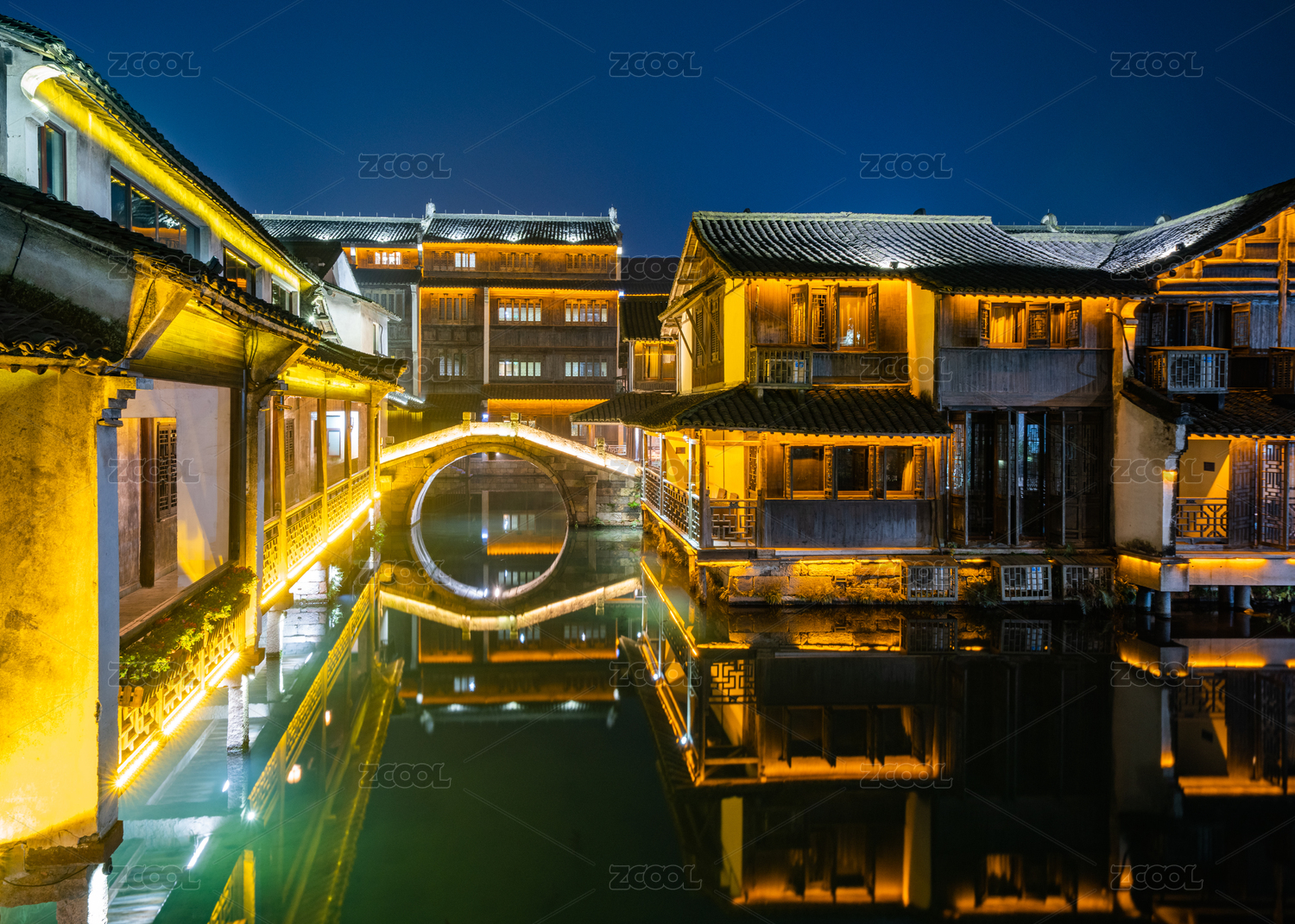 水乡,古镇,夜景,夜色,石拱桥,光,被照亮的,运河,湖畔,河道