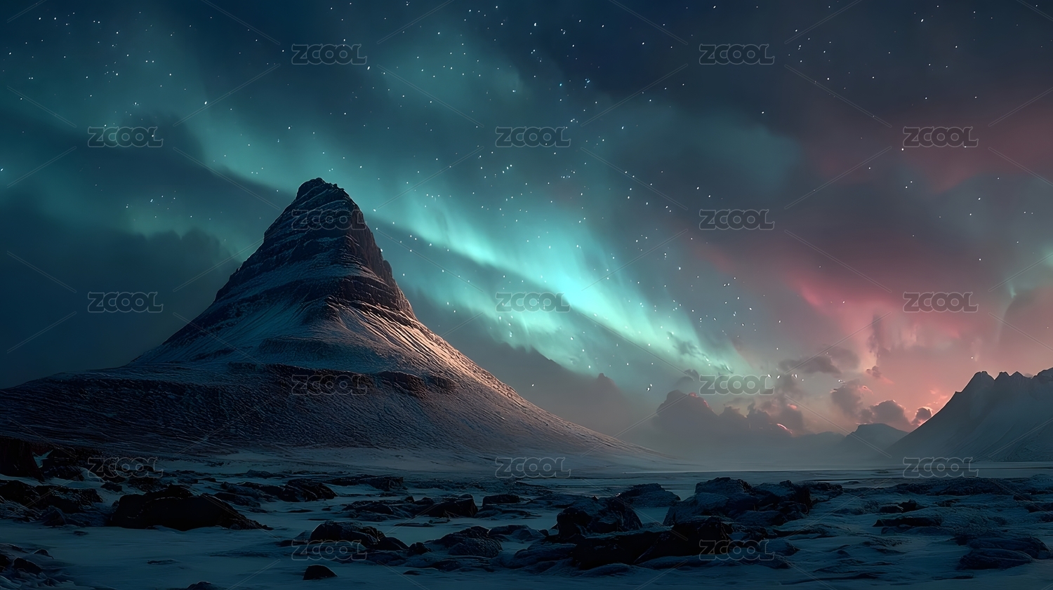 极光下的雪山夜空