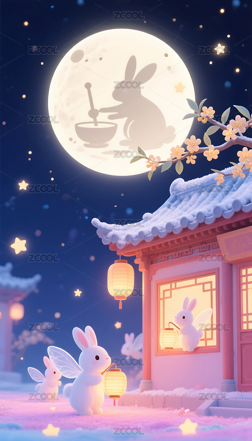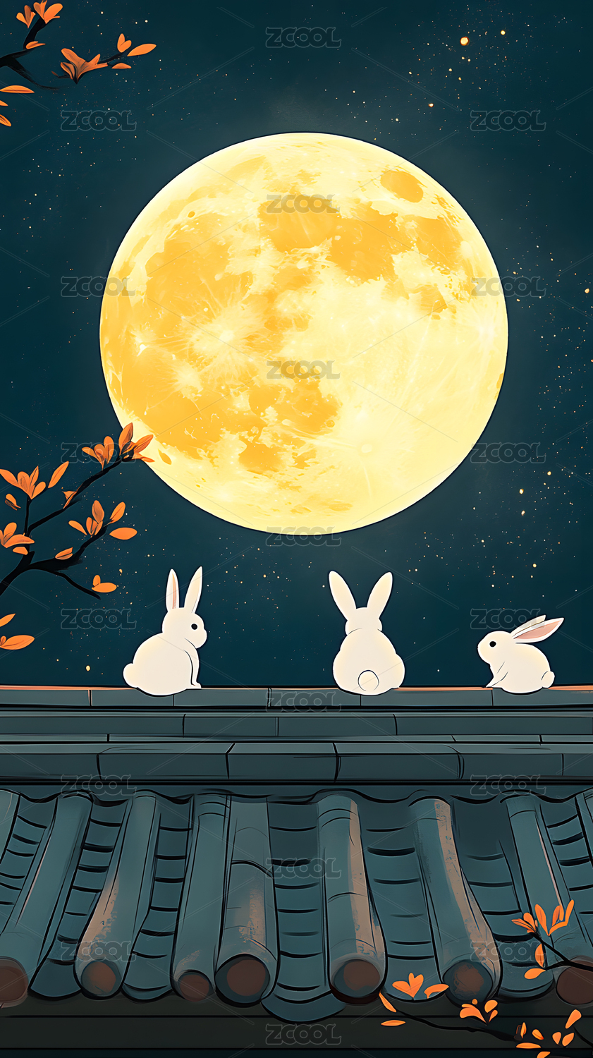 建筑,意境,插画,壁纸,夜空,唯美,月亮,兔子,中秋节,赏月