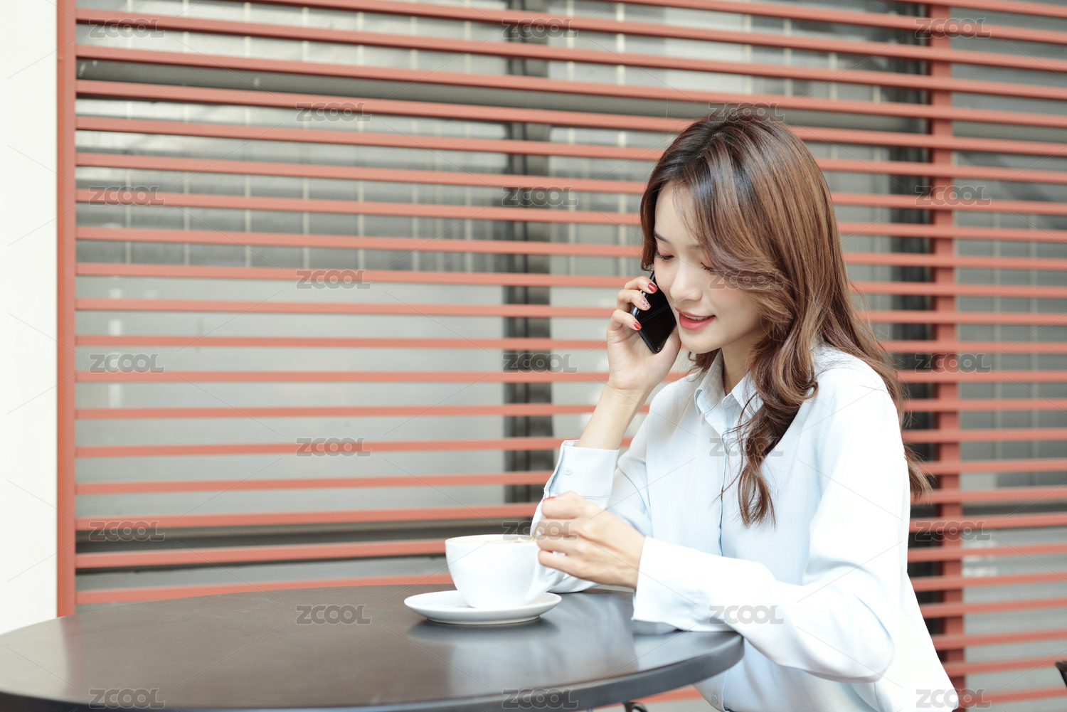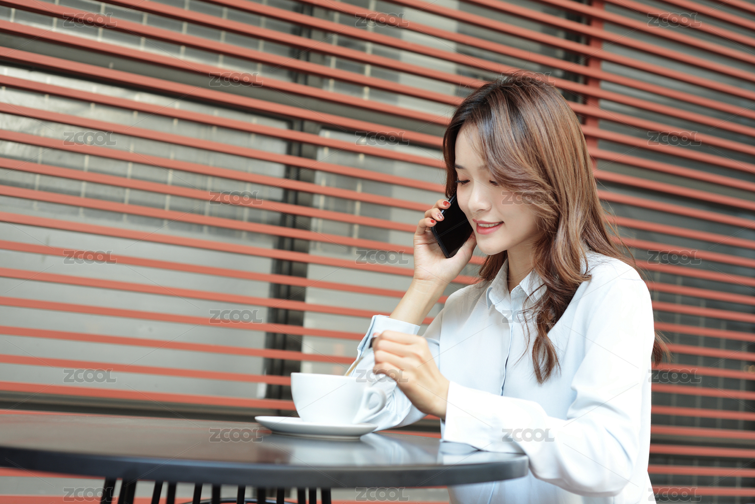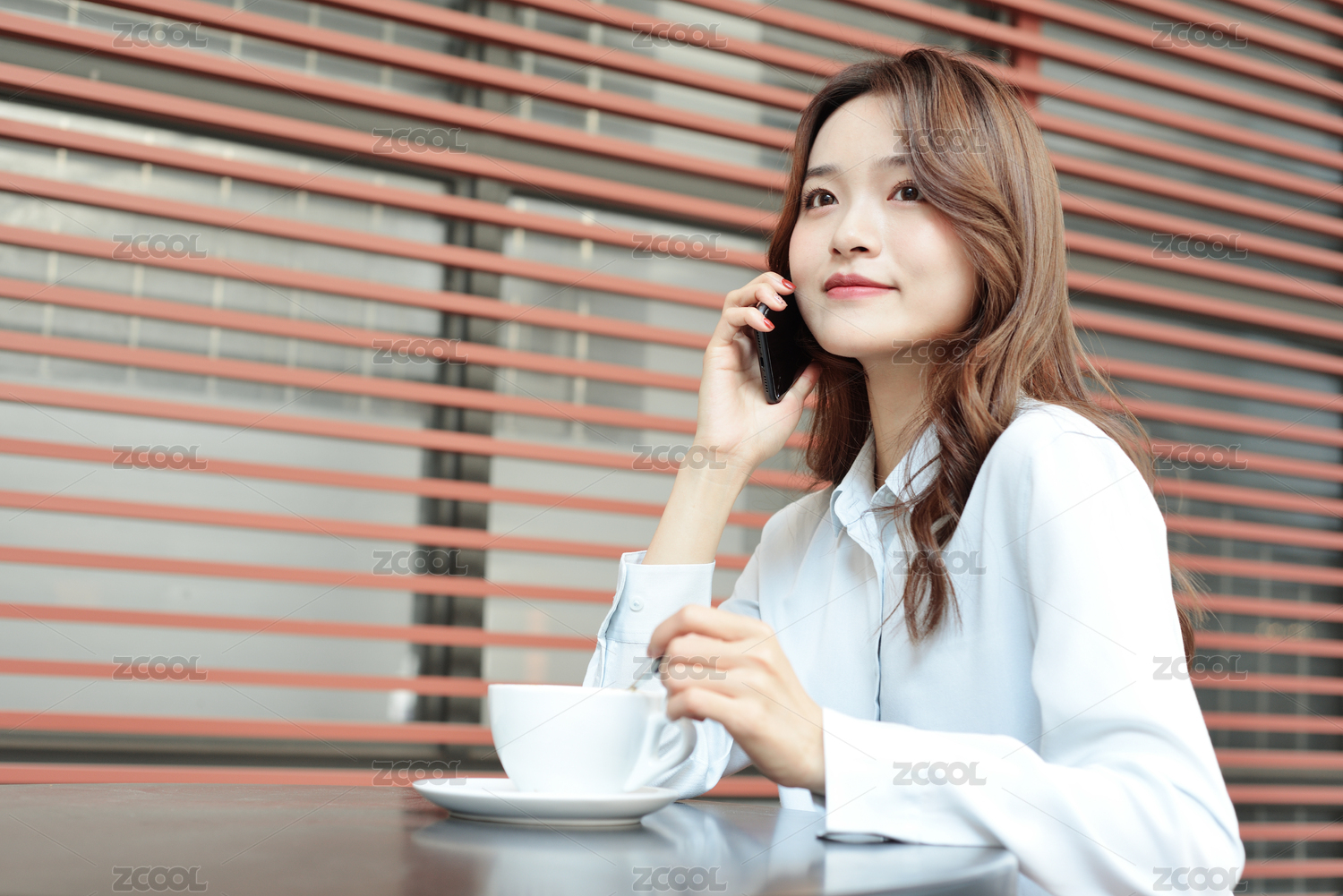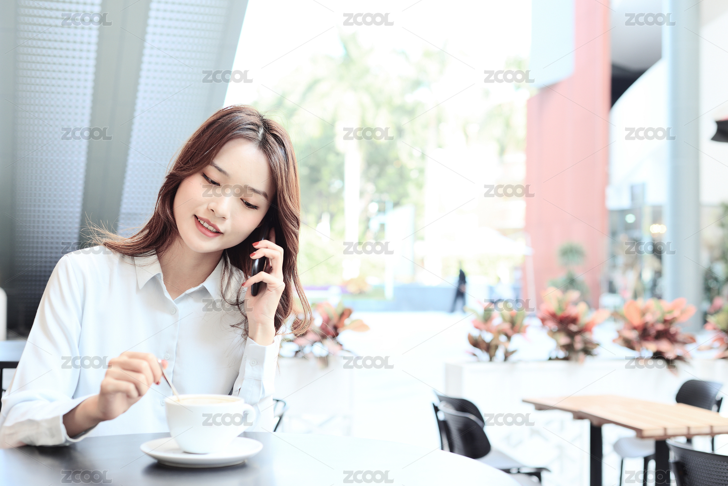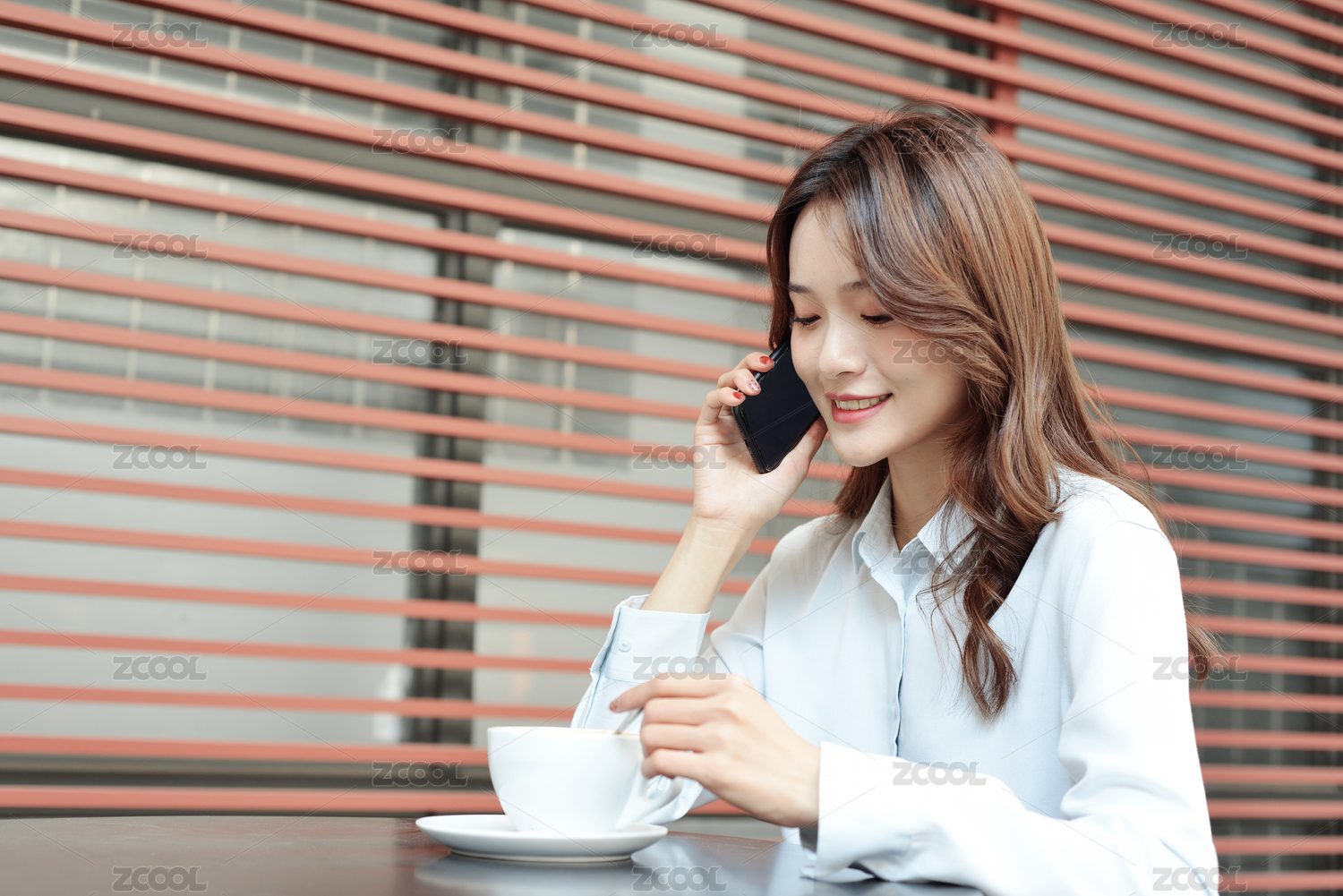 一个中国女白领坐在咖啡厅的桌子边用手机打电话