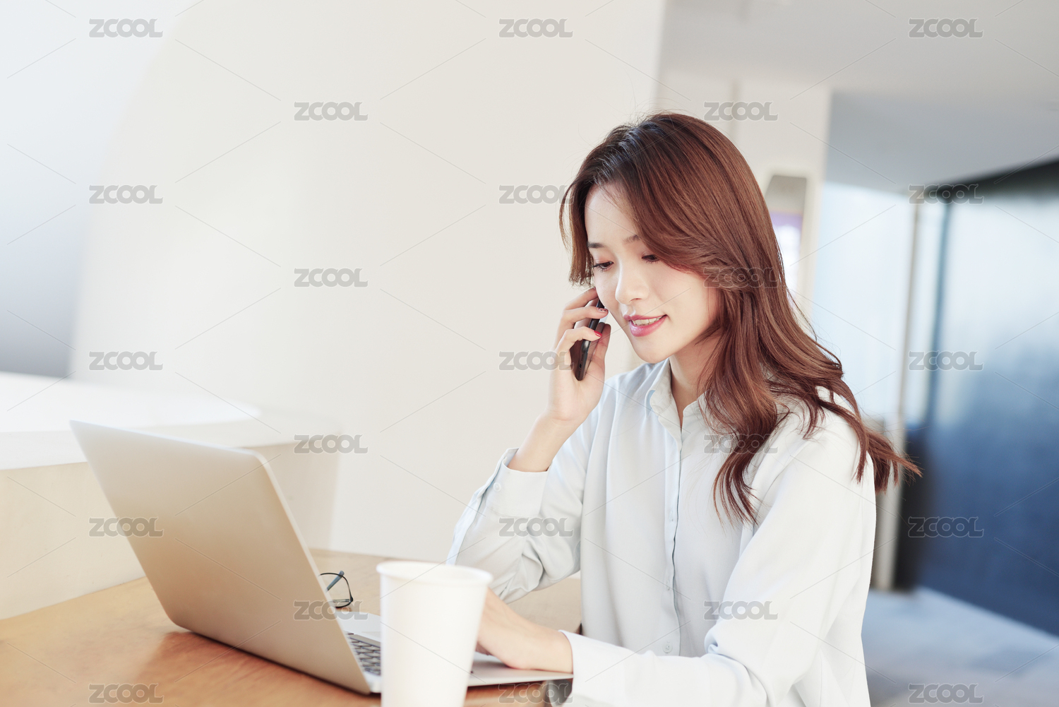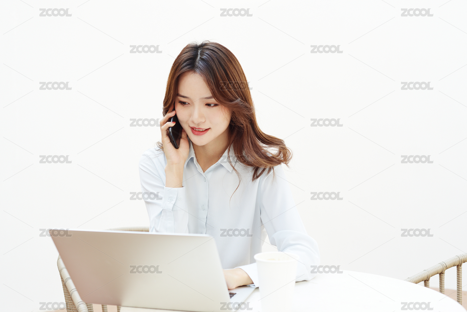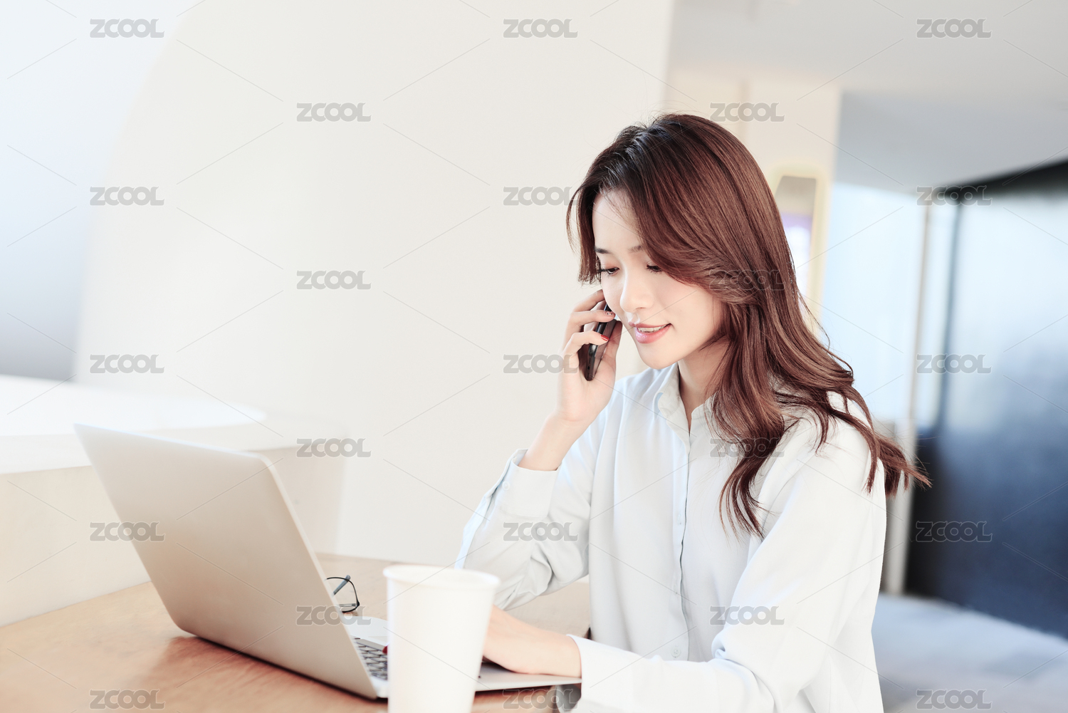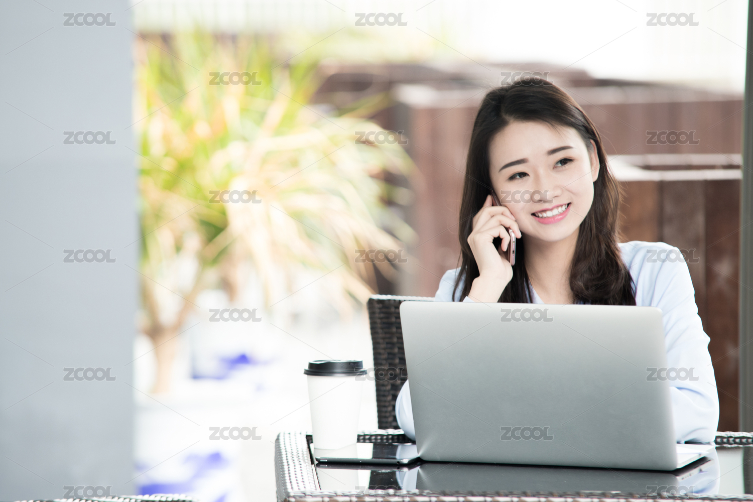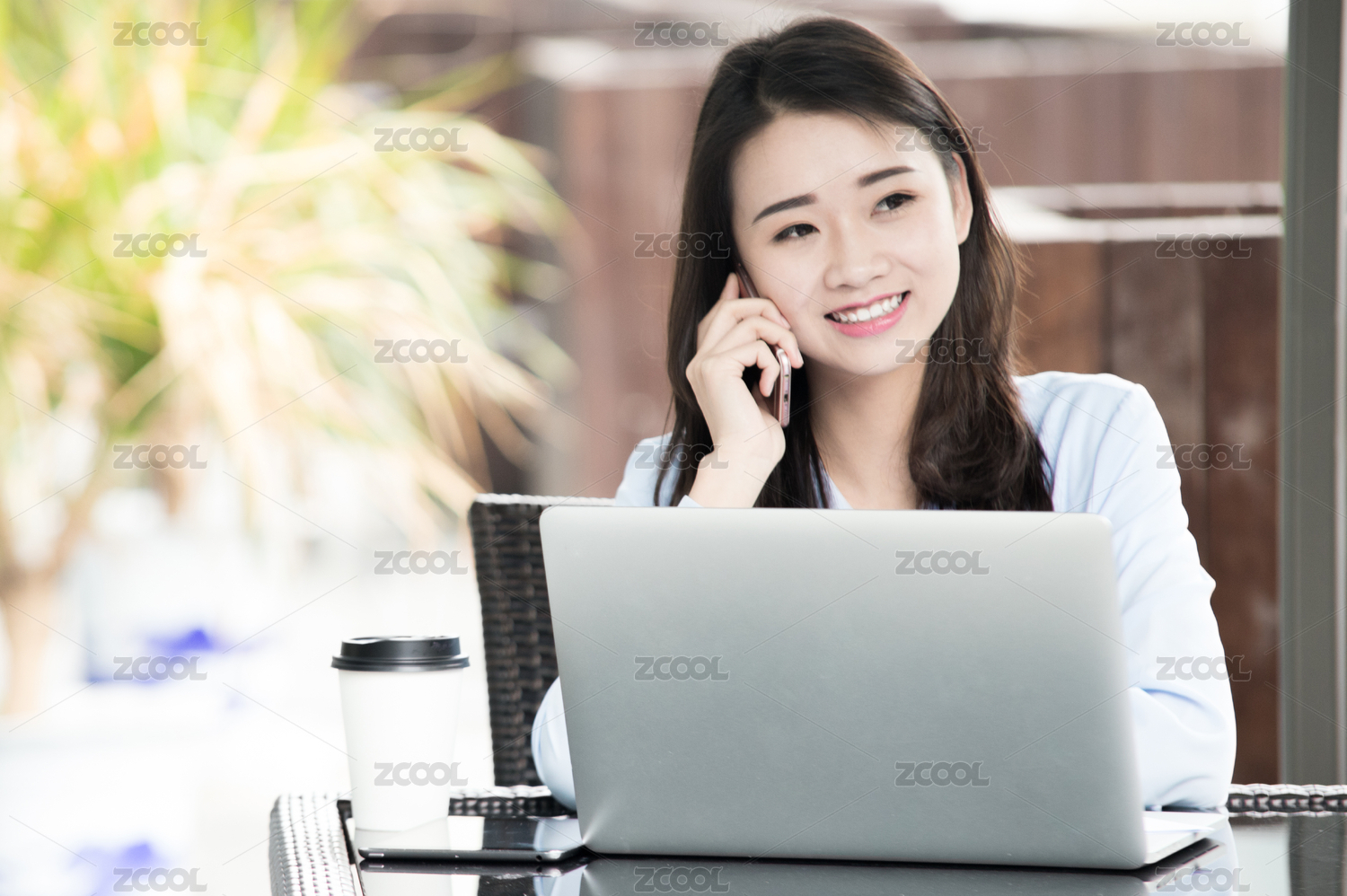 一个中国女白领坐在咖啡厅的桌子边用手机打电话