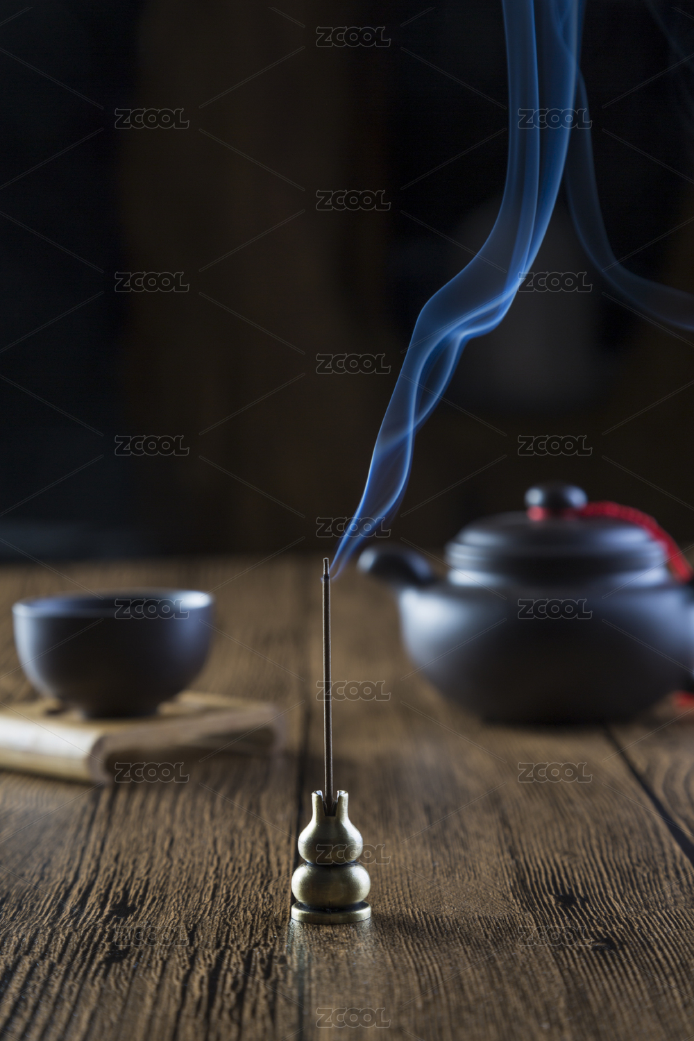 陶瓷茶具和袅袅飘散的沉香烟雾