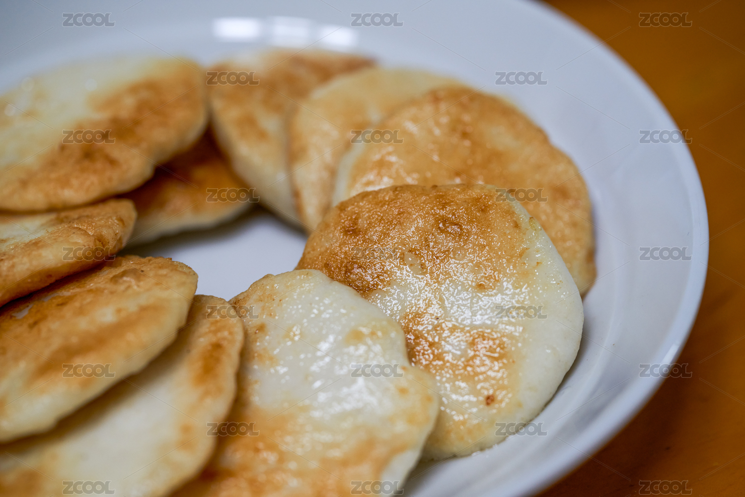 暗色木纹卓上放着一盘刚烙好的肉饼