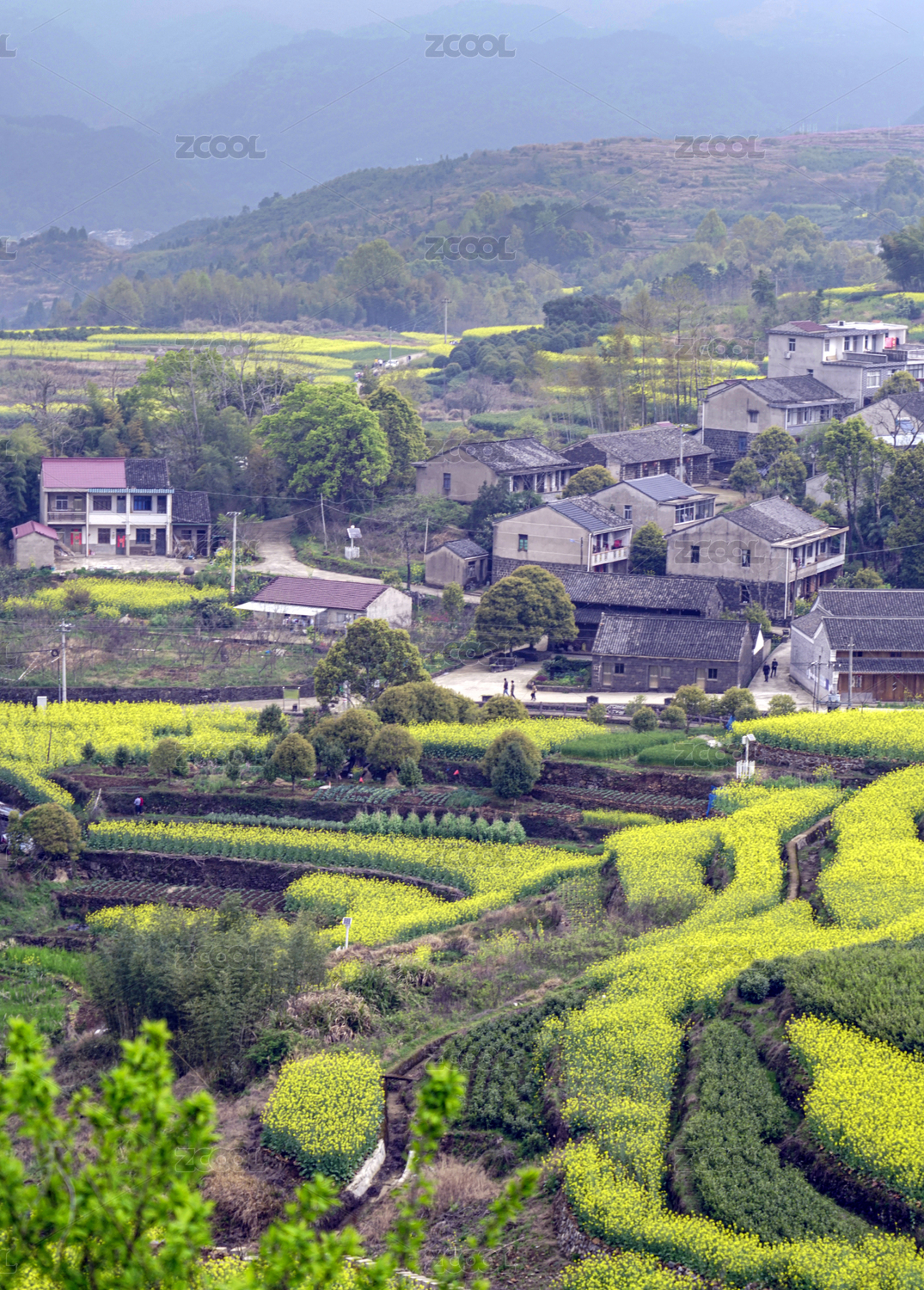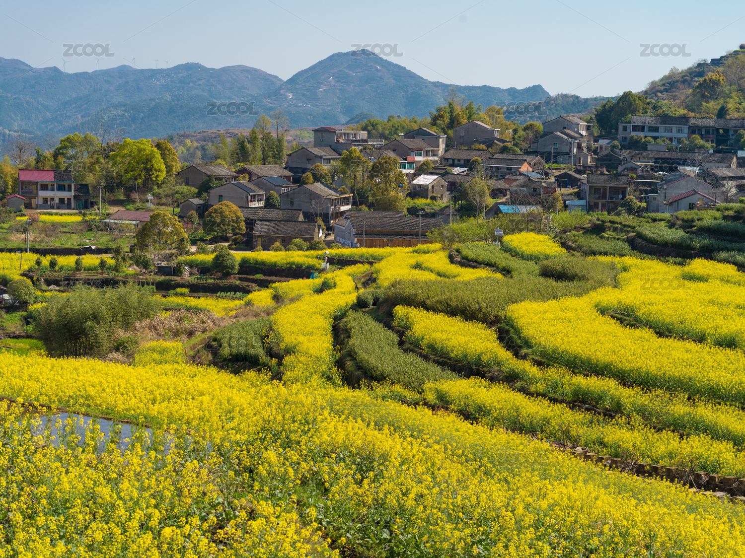 陕西安康市汉阴县凤堰古梯田村庄春天油菜花