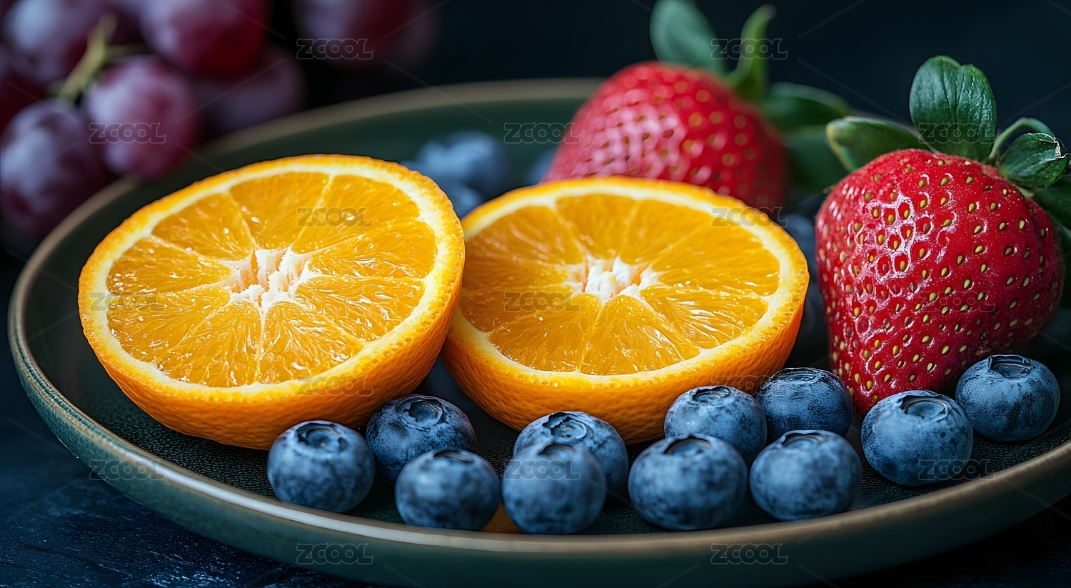 水果,橙子,草莓,蓝莓,水珠,水滴,清新,水果拼盘,静物摄影,美食摄影
