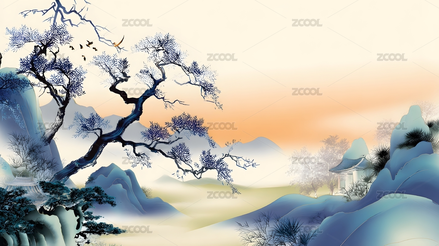 数码复古蓝色花卉装饰抽象图形海报网页背景