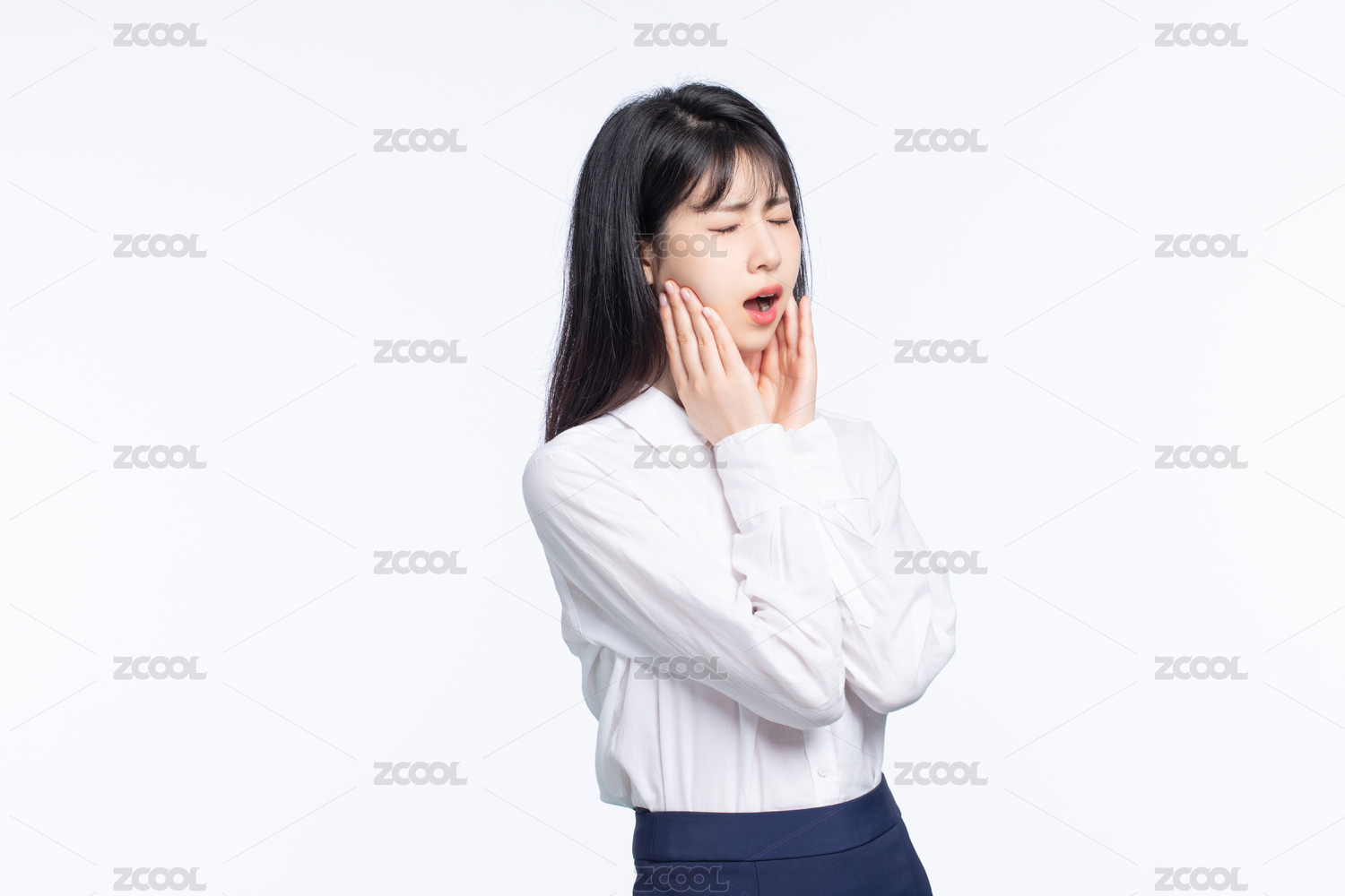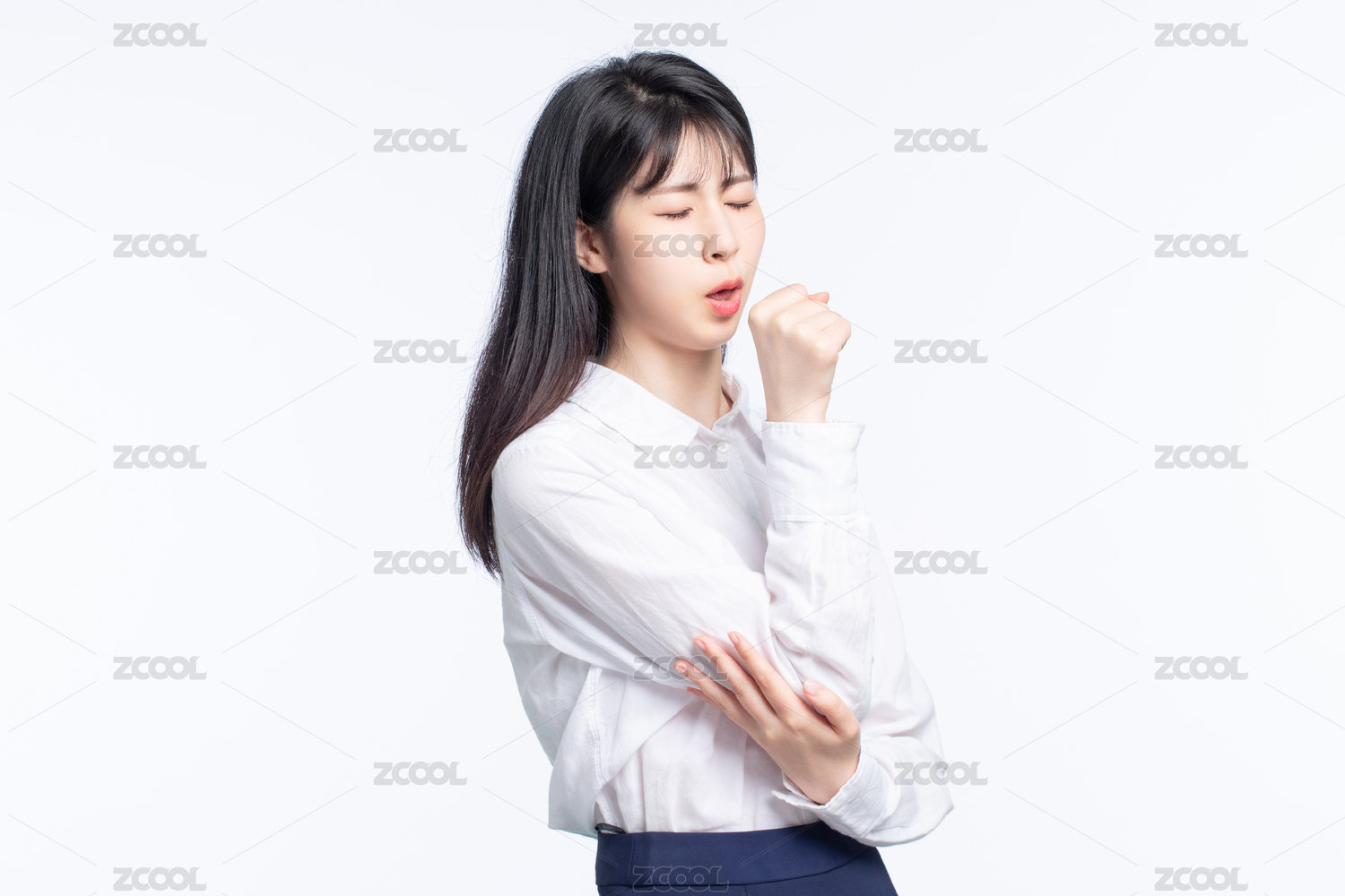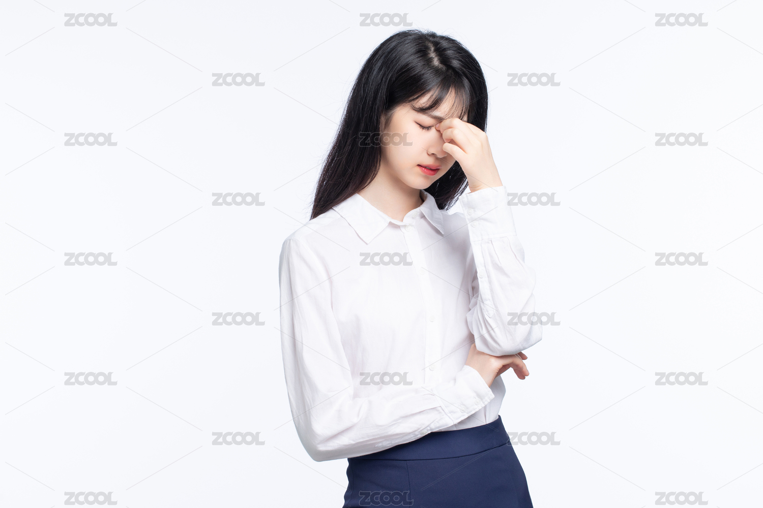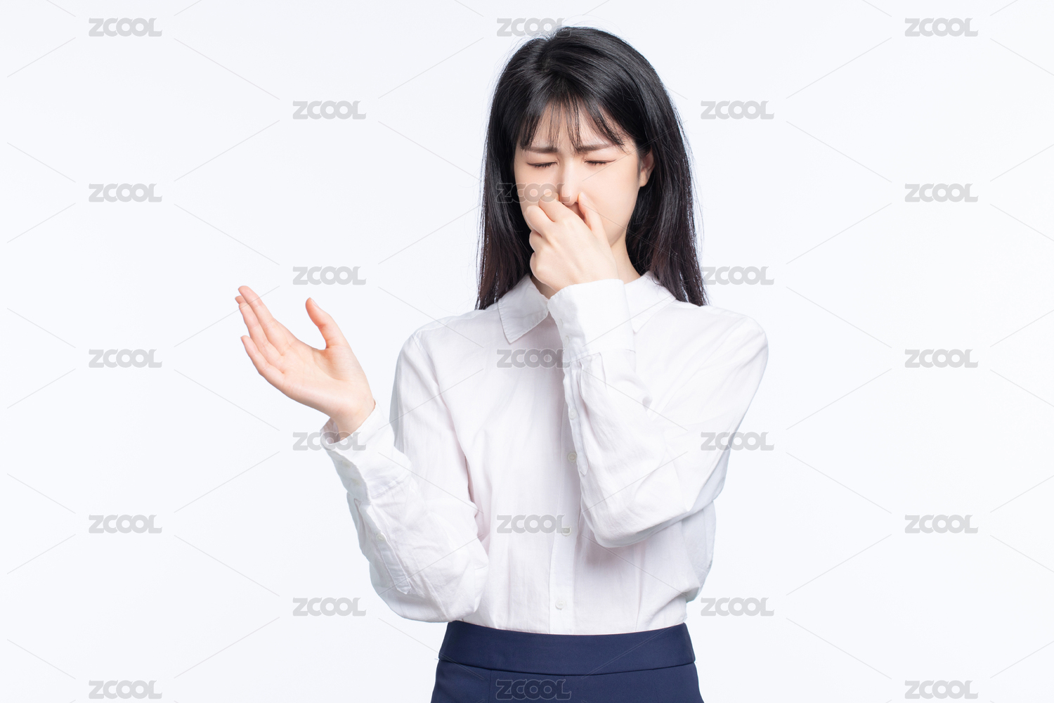 白色背景下一个中国人因为过度劳累而打哈切伸懒腰犯困