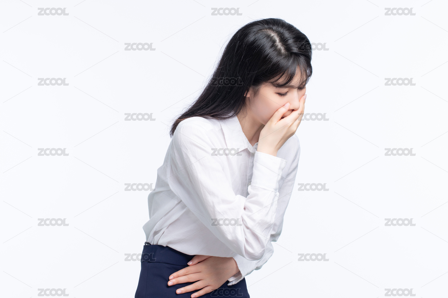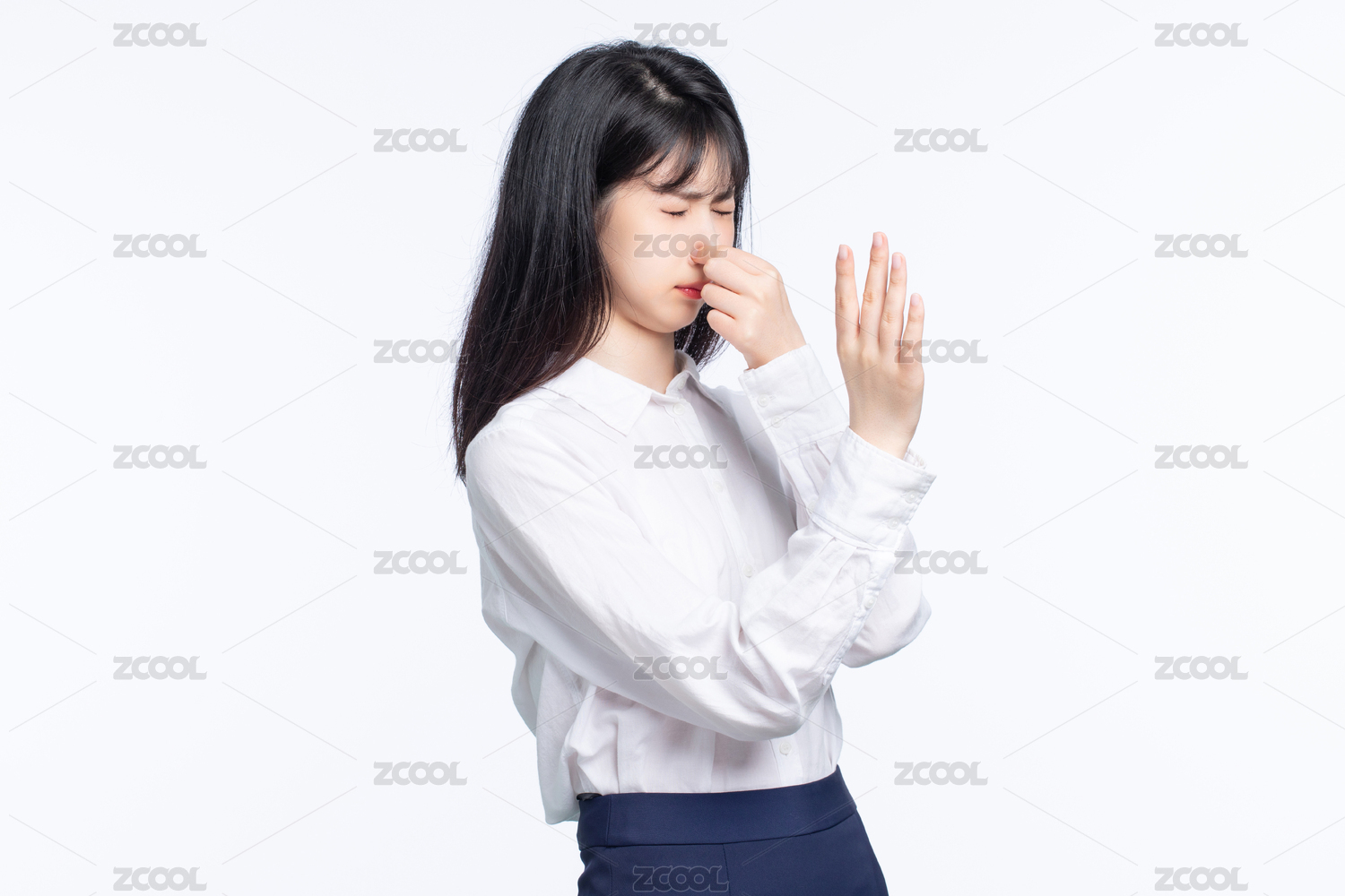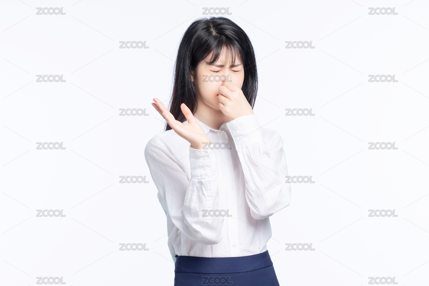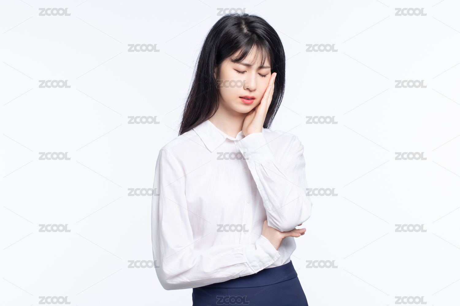 白色背景下一个中国人因为过度劳累而打哈切伸懒腰犯困