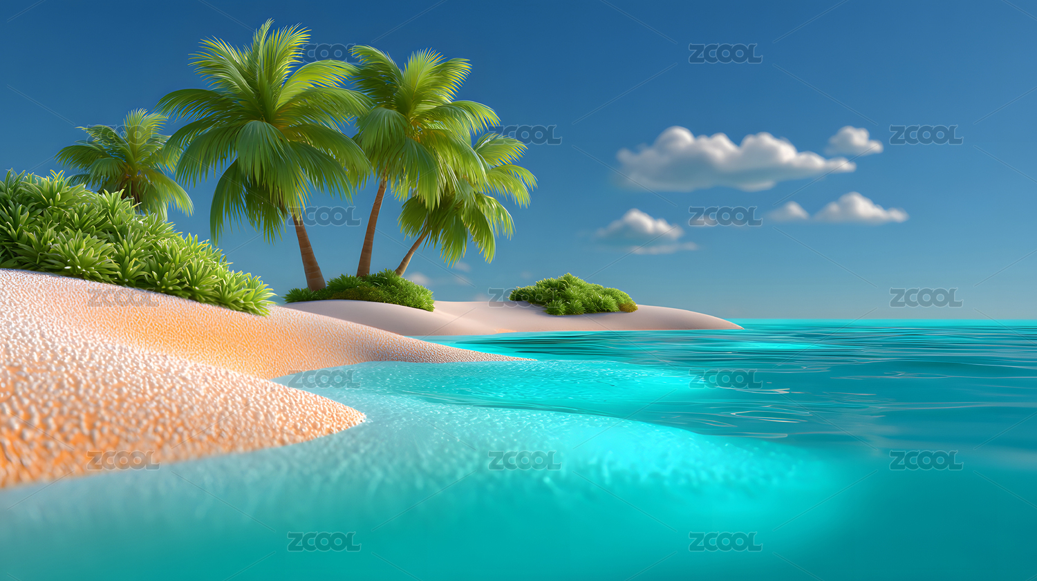 卡通,岛屿,棕榈树,椰子,天空,蓝色,阳光,发光,海滩,水