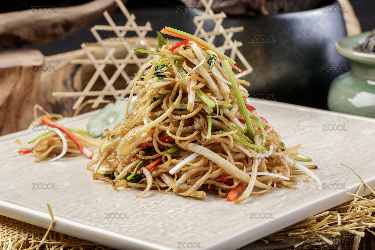 米色放瓷盘装的炝炒素三丝摆放在草垫子上
