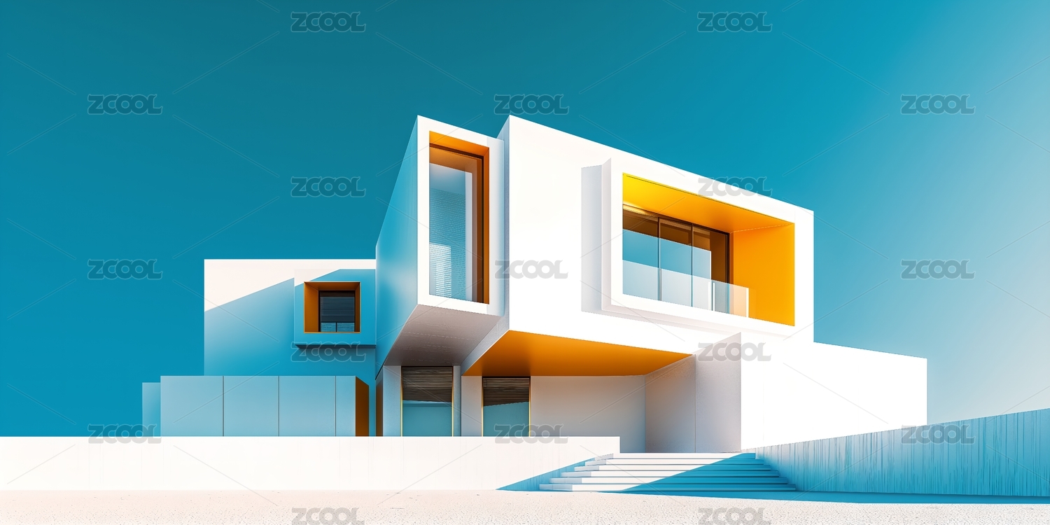 蓝天下的一栋白色墙面搭配黄色点缀简约别墅
