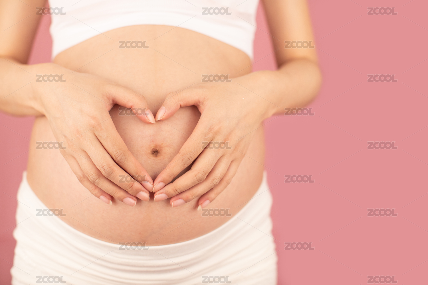 孕妇用双手在肚子上比出爱心形手势正面拍摄