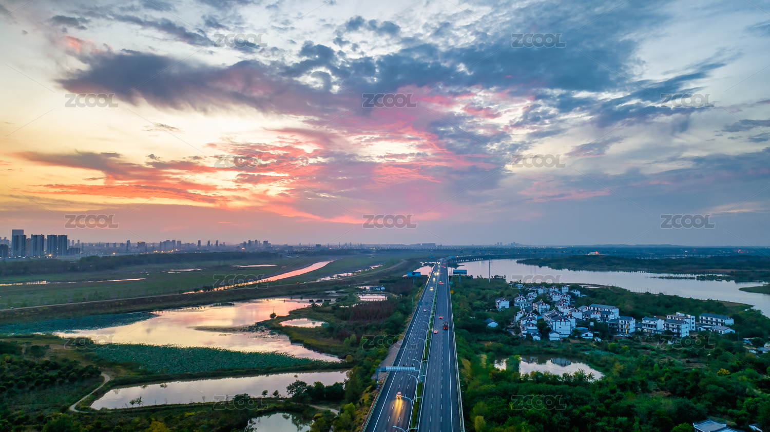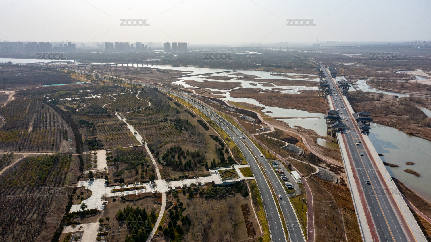 航拍虎丘湿地公园,苏州近郊,公路桥在美丽
