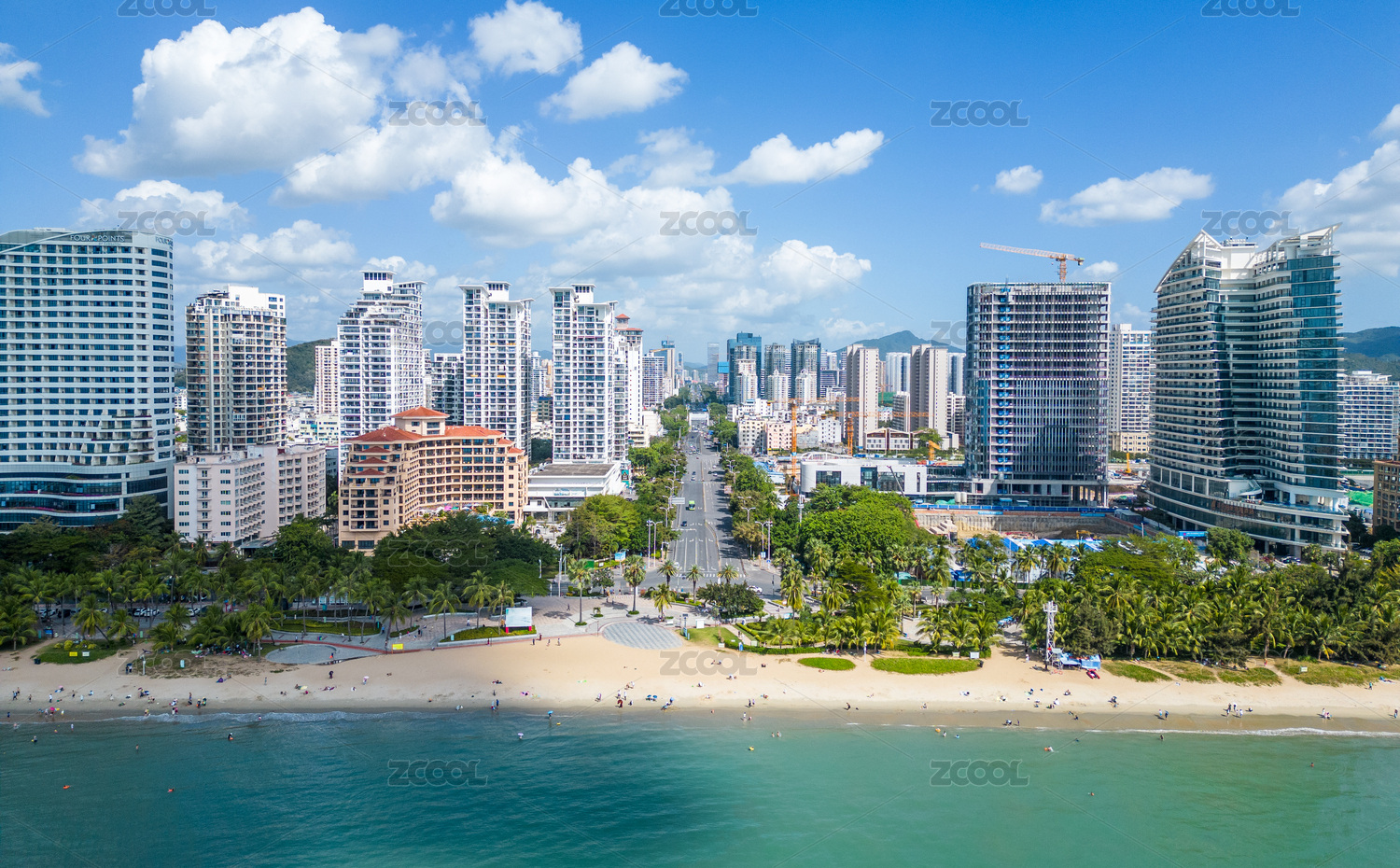 航拍中国海南三亚湾旅游度假区海水浴场椰林沙滩