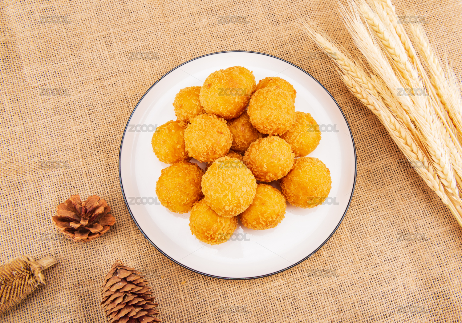 格子桌布背景美味小吃油炸香芋地瓜丸