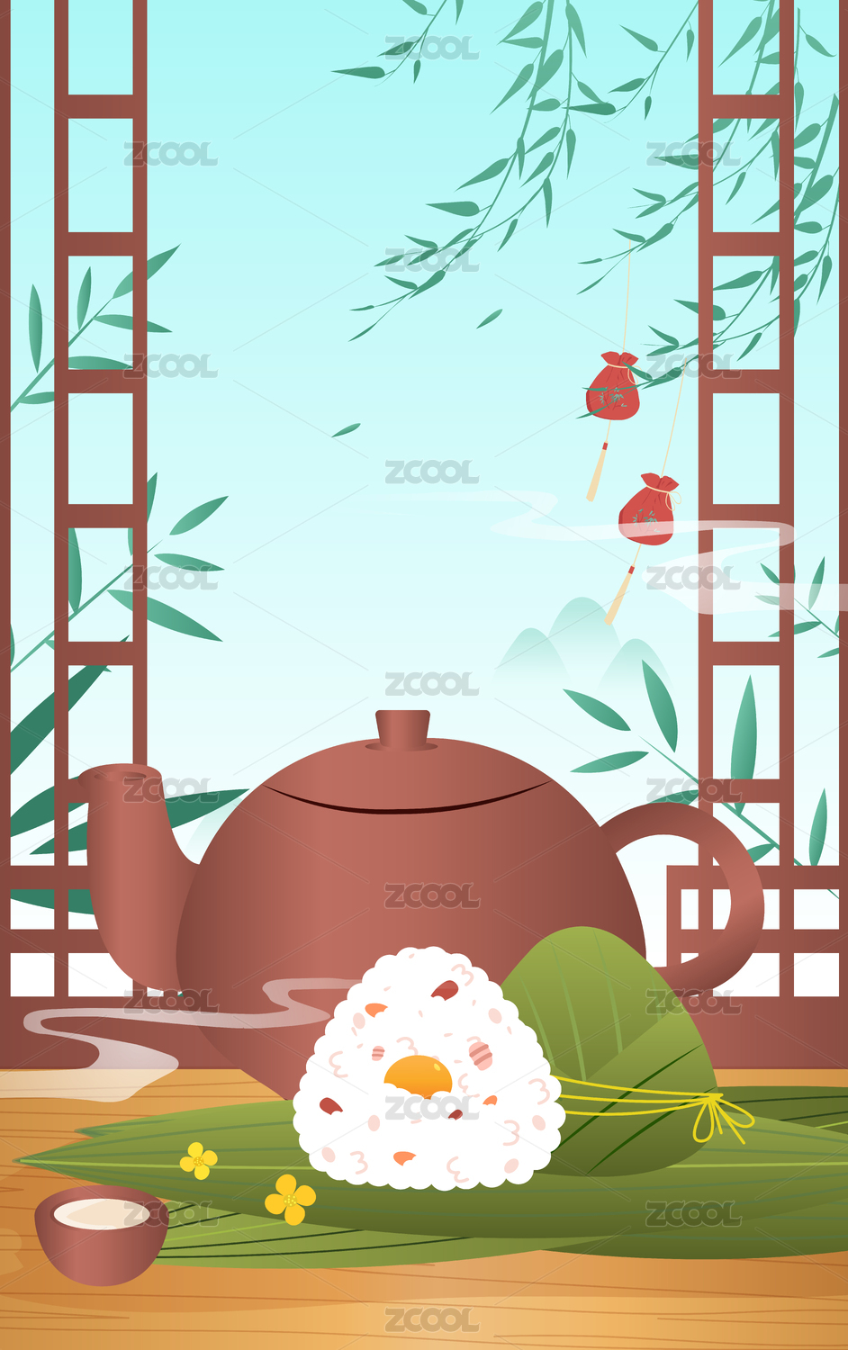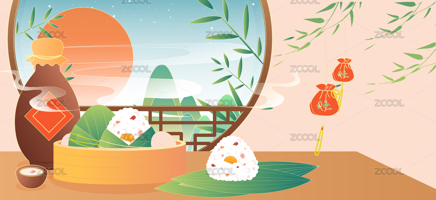 窗户里桌子上摆放的端午粽子和酒矢量插图
