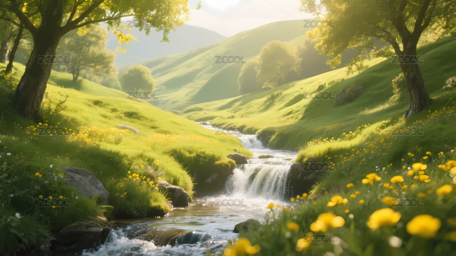 树木,户外,风景,绿色,夏天,草地,草原,山坡,溪水,河流