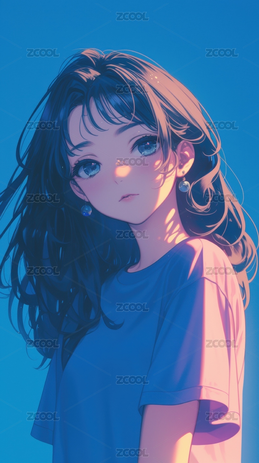 蓝光下的动漫少女
