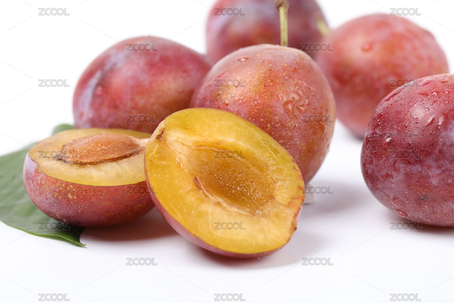 白底上放着切开的三月李
