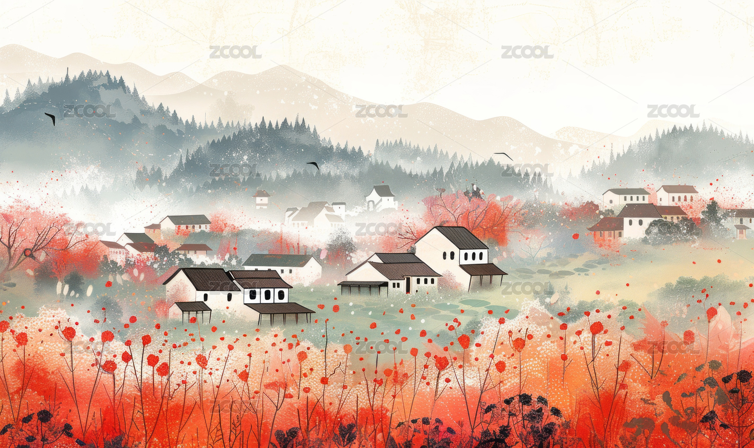 中国传统山区古建筑民居景观插画