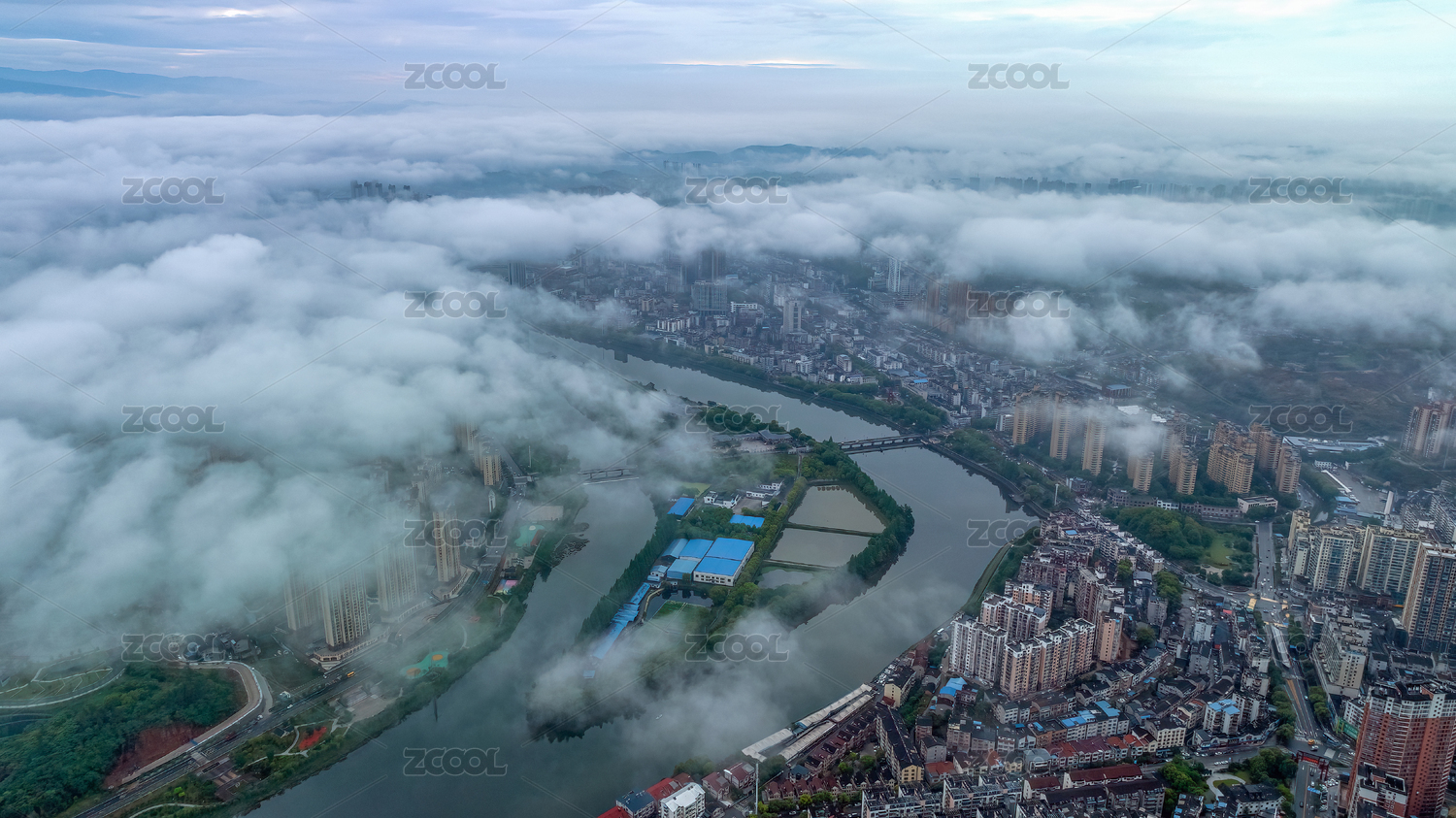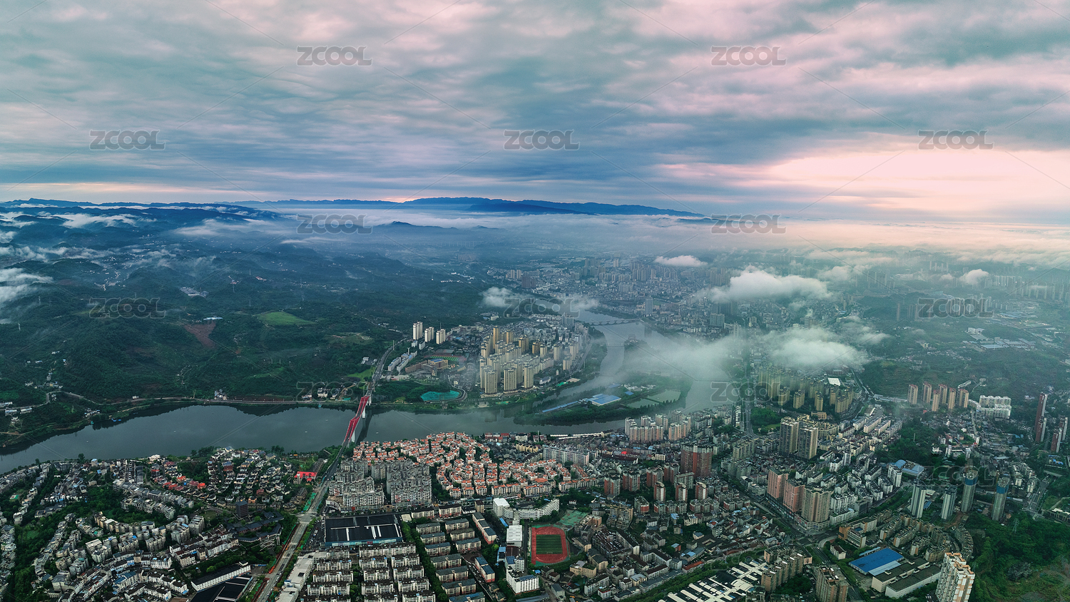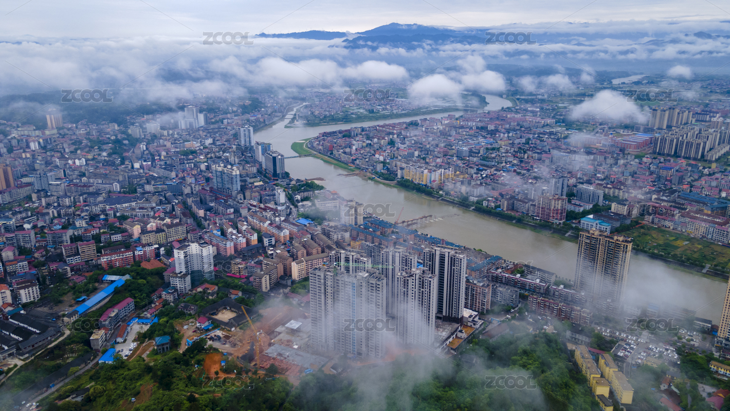 中国湖南溆浦县城建筑云雾缭绕高空航拍图