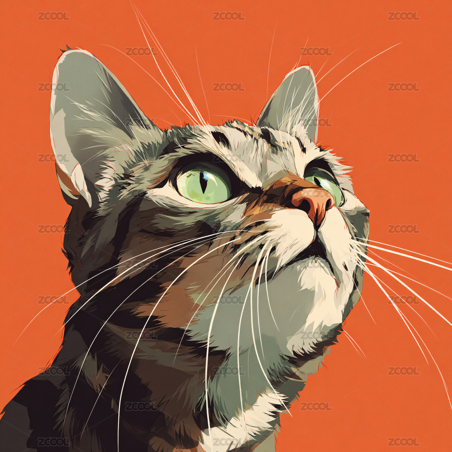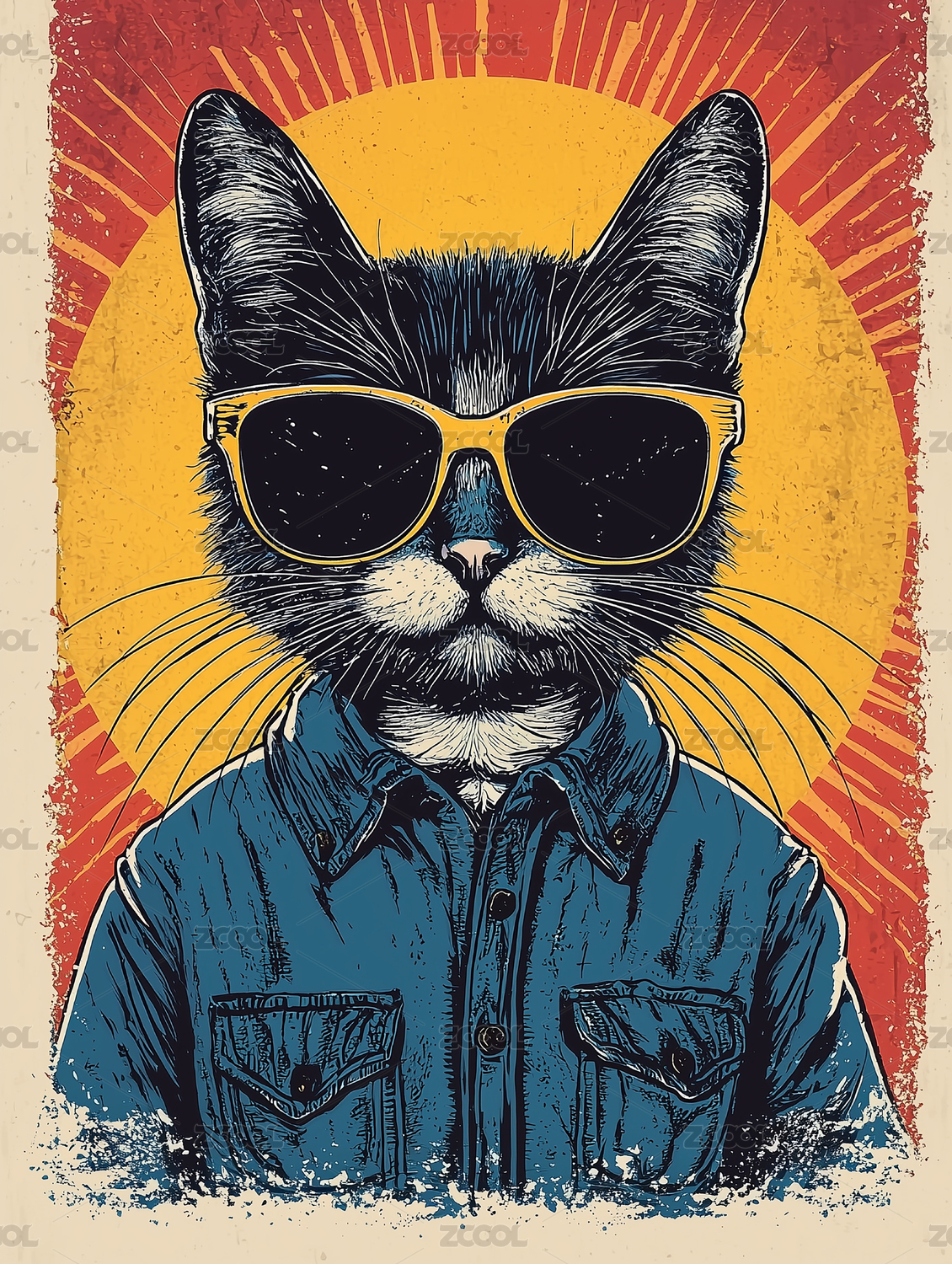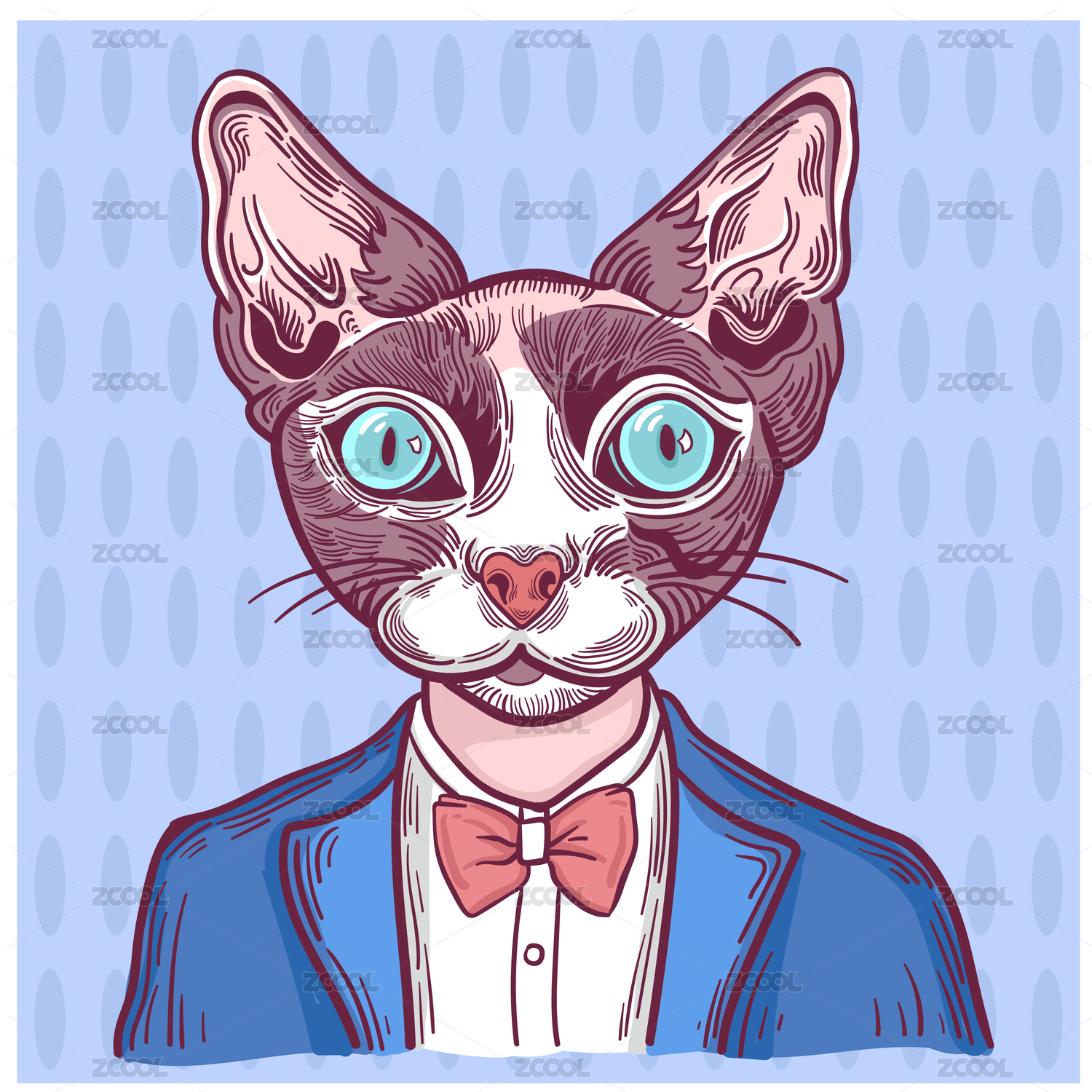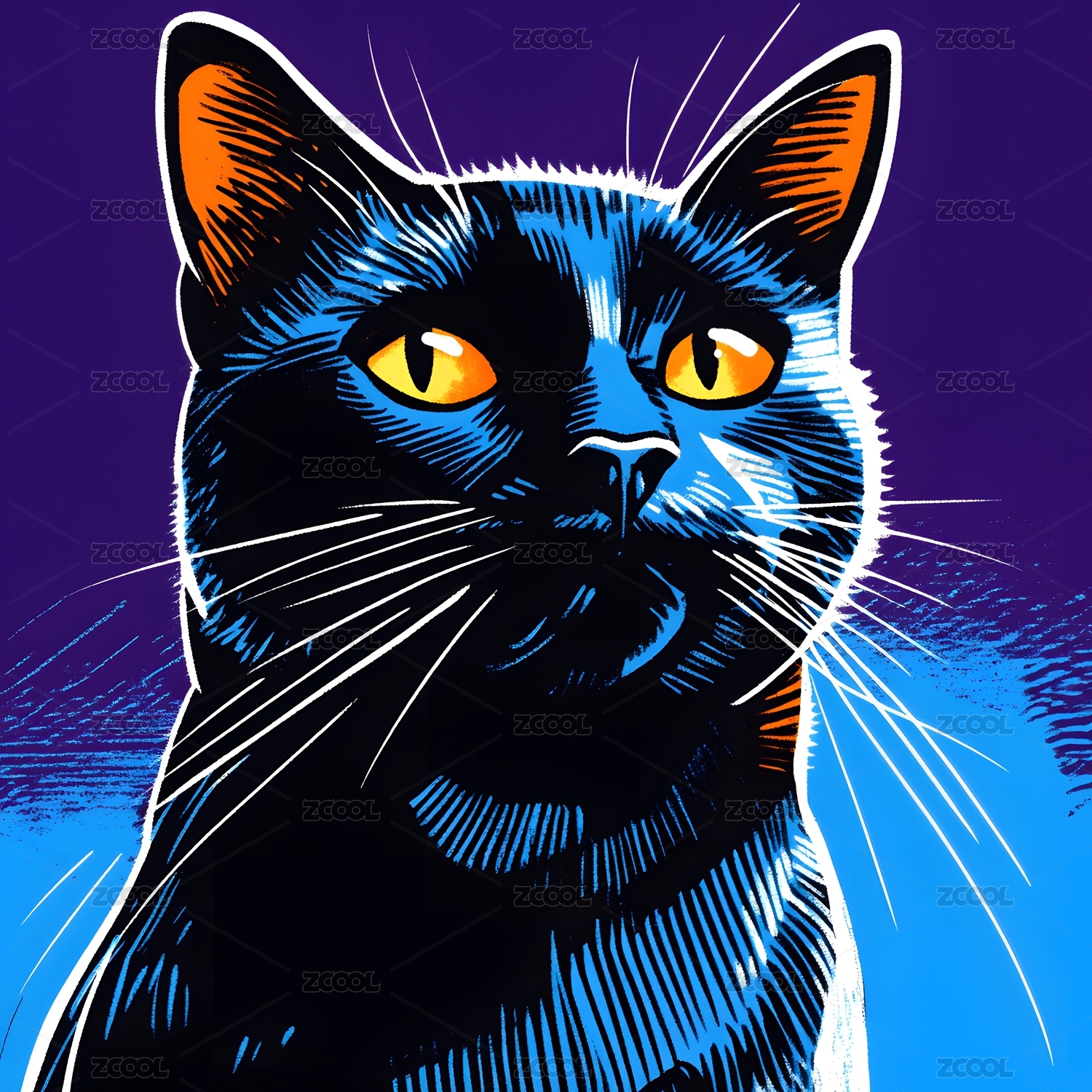 猫木刻版画风格复古时尚艺术拟人动物插画