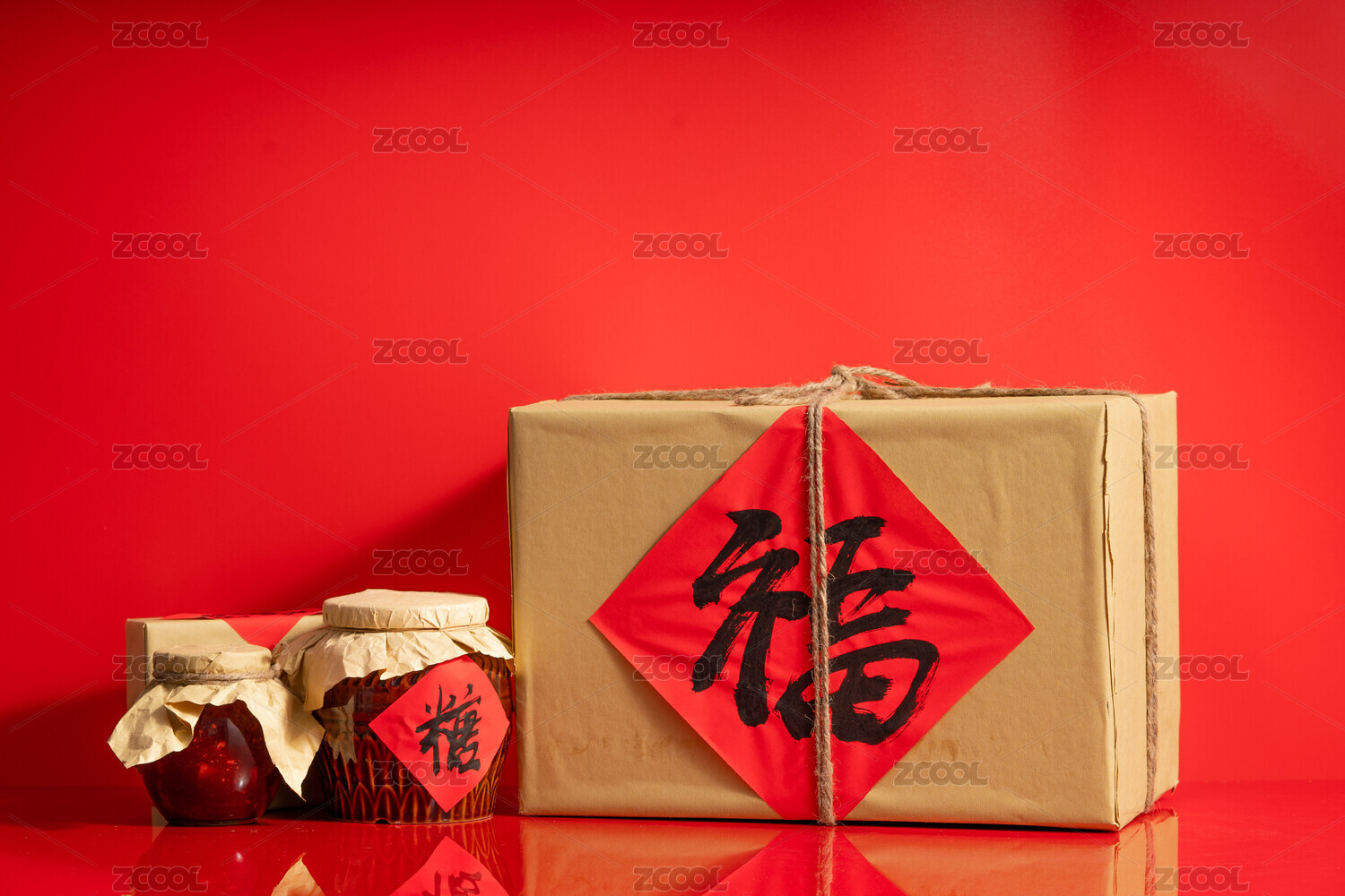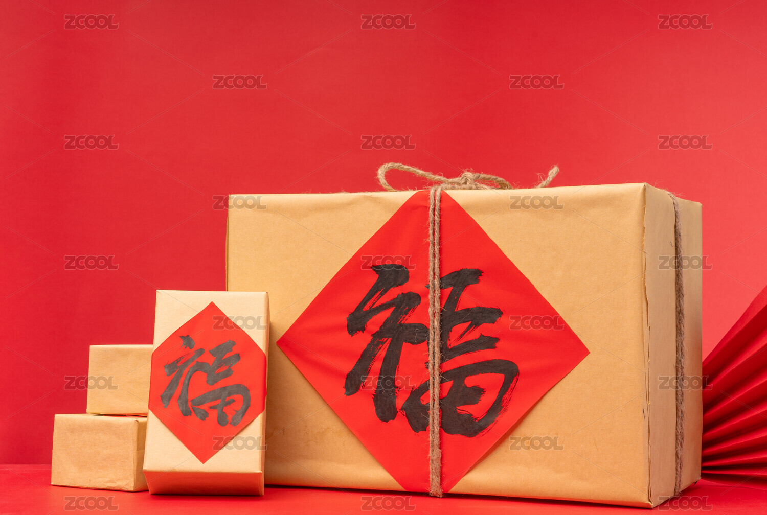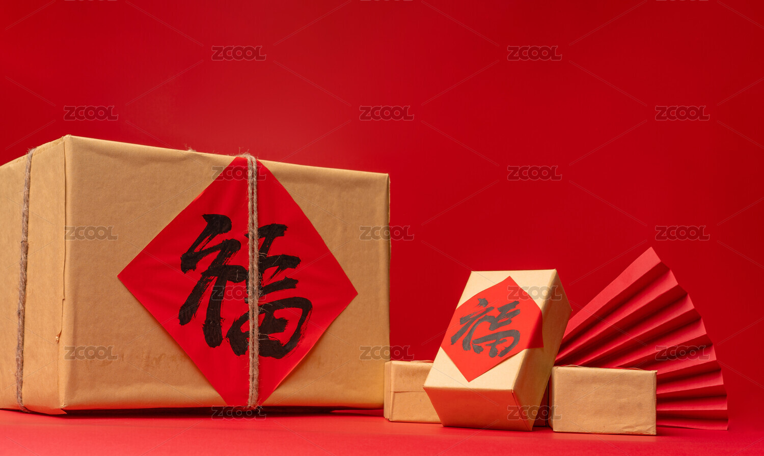 充满中国节日气息的背景下摆放着多个礼品盒及礼品
