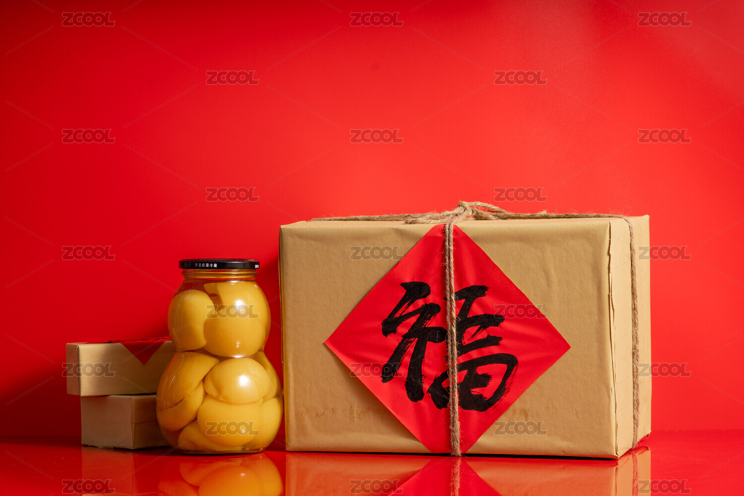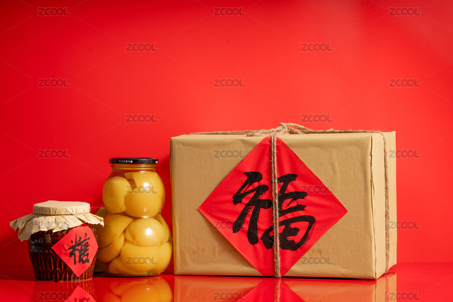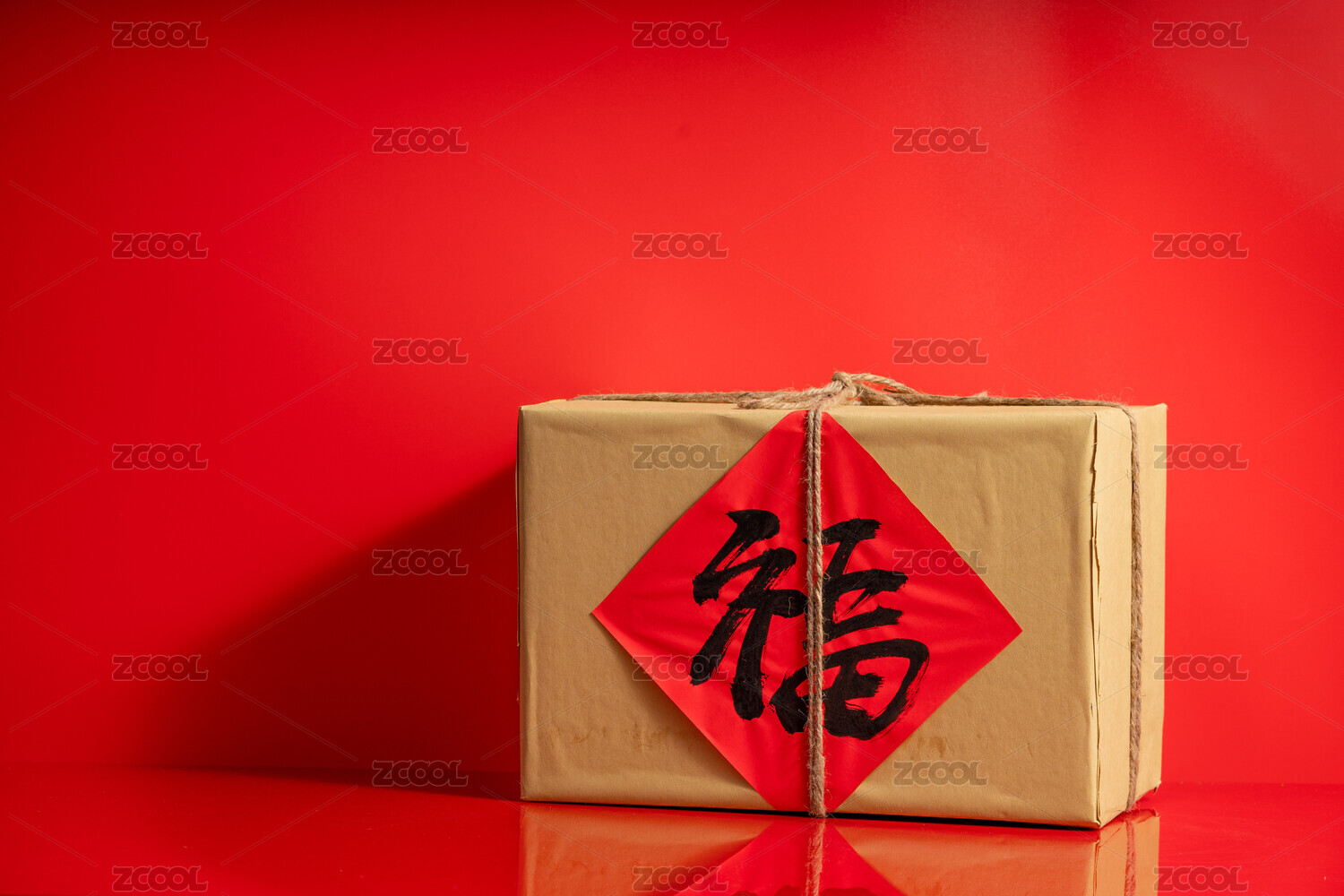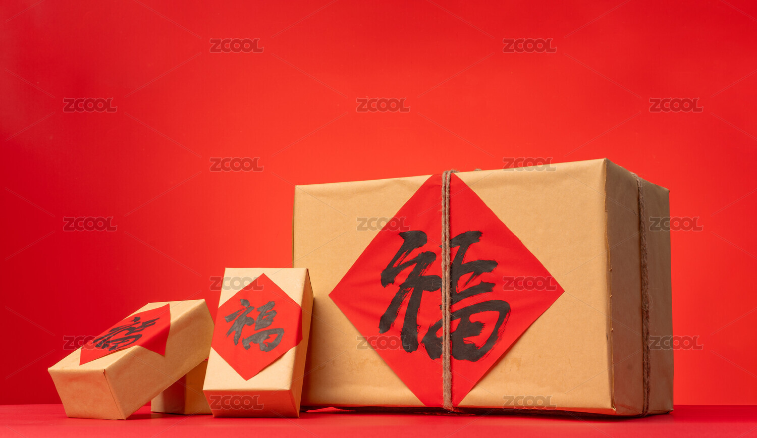 充满中国节日气息的背景下摆放着多个礼品盒及礼品