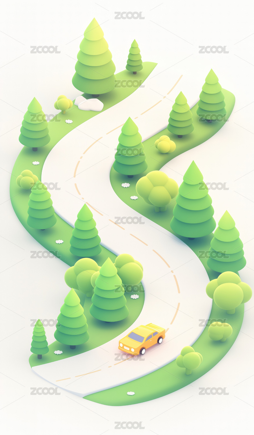 汽车行驶在蜿蜒的马路上,两旁种满绿树