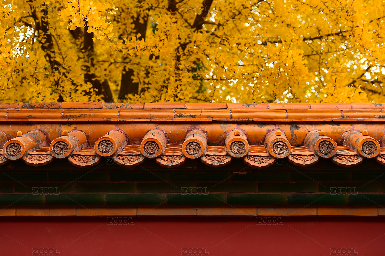 中国北京秋天银杏掩映下的宫墙屋檐