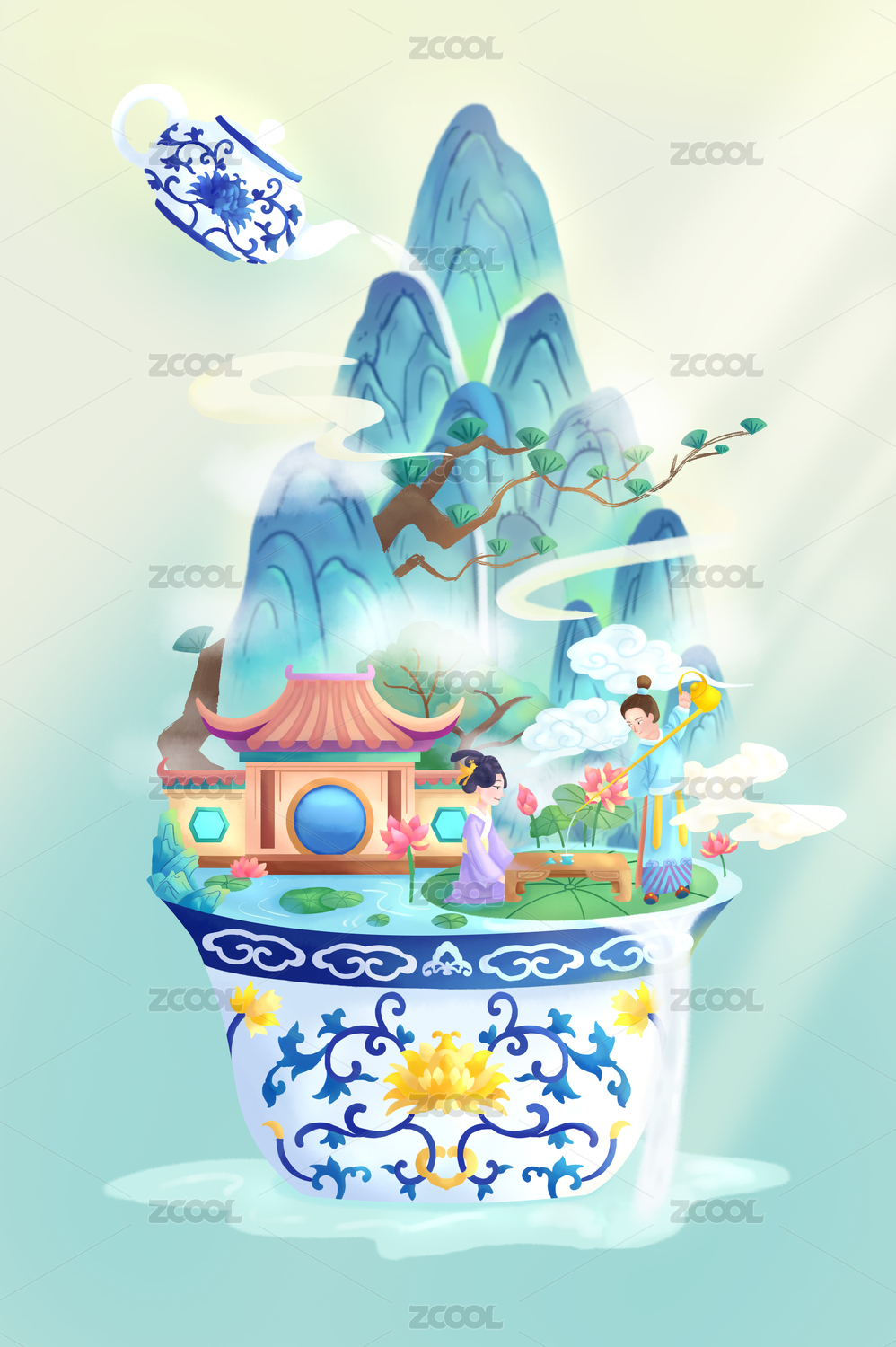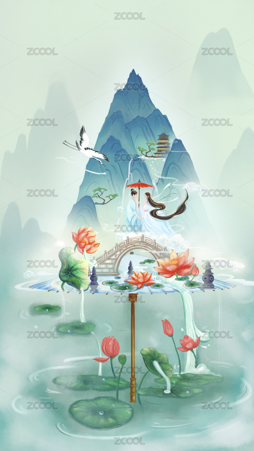 中国风,七夕,插画,山,云,传统,HEYYTGF2020,人物,场景,风景