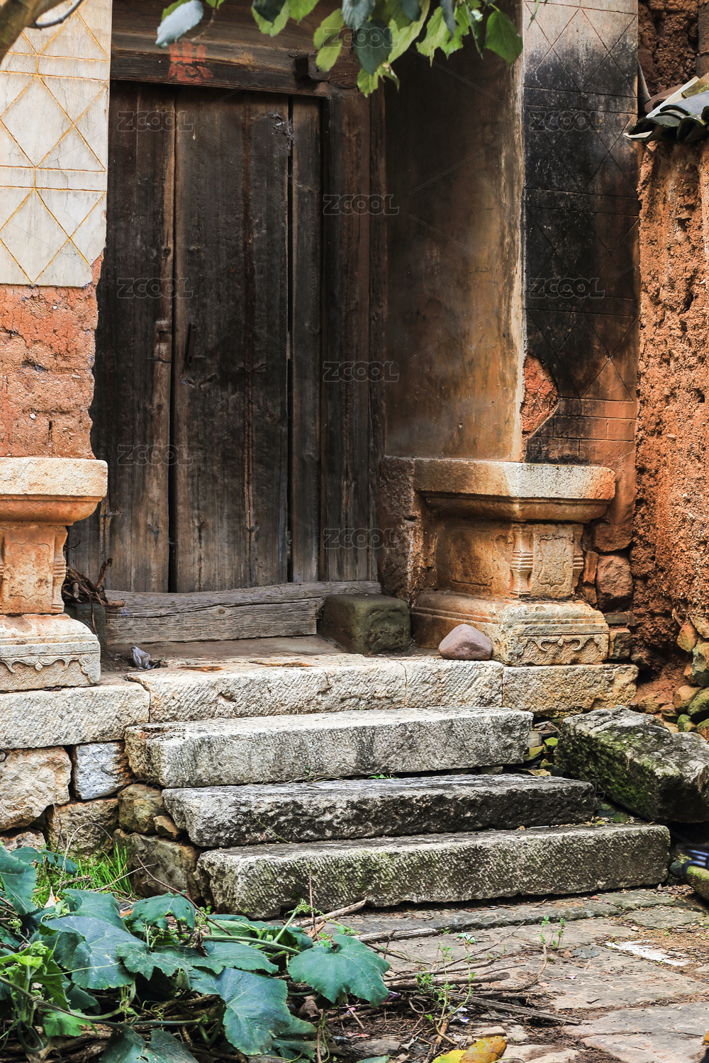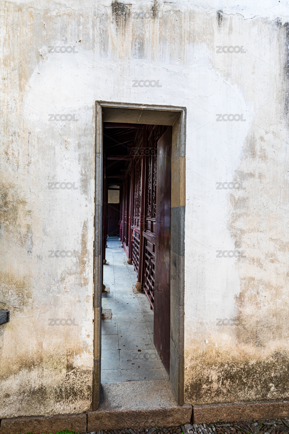 绿色植物在安徽,中国的古村落传统房屋的木门。