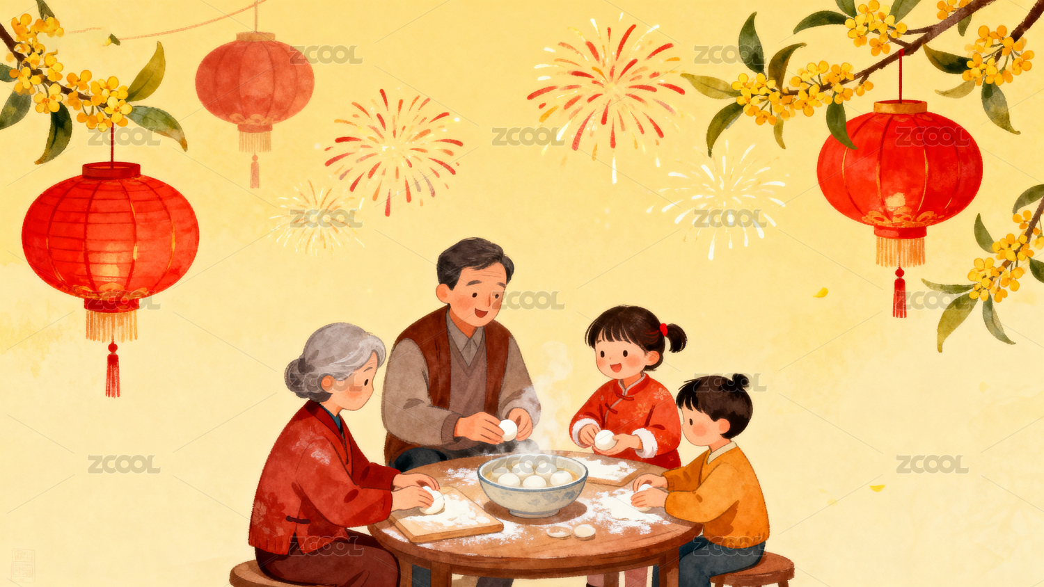 家人围坐火锅宴 烟花灯笼庆团圆
