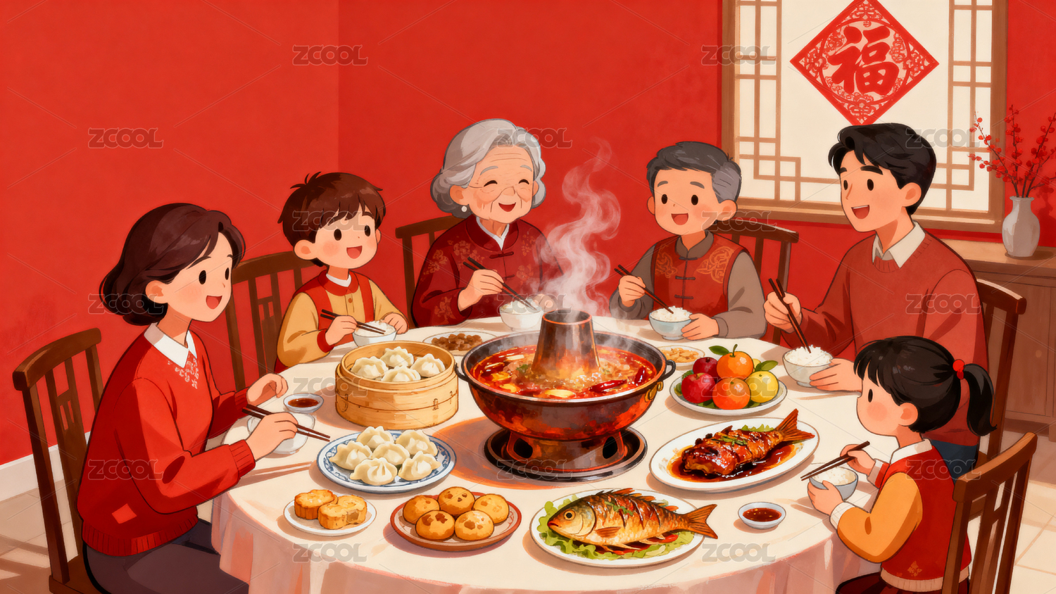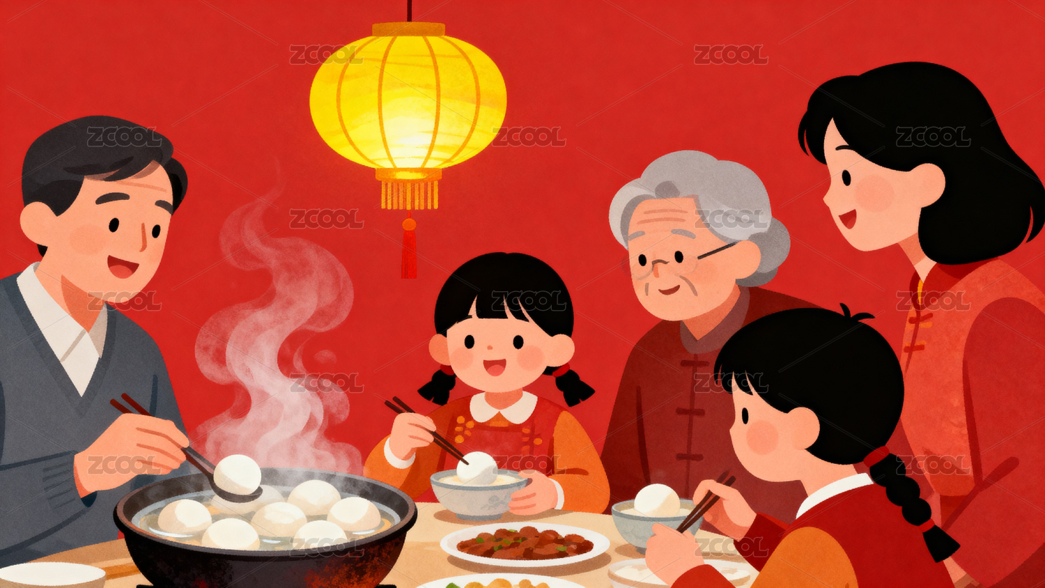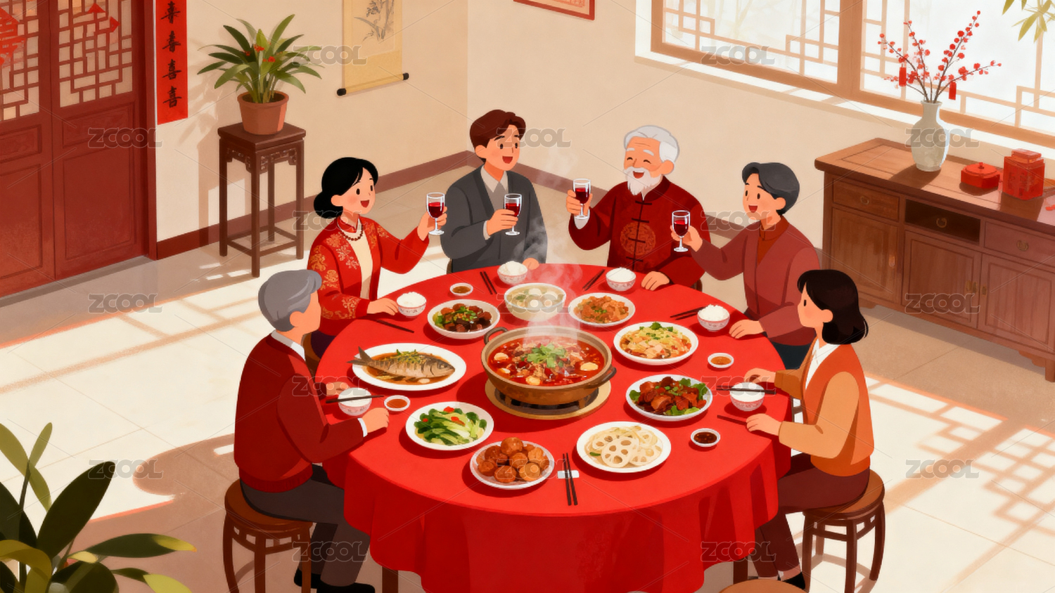 除夕夜一家人吃年夜饭2023新年春节插画