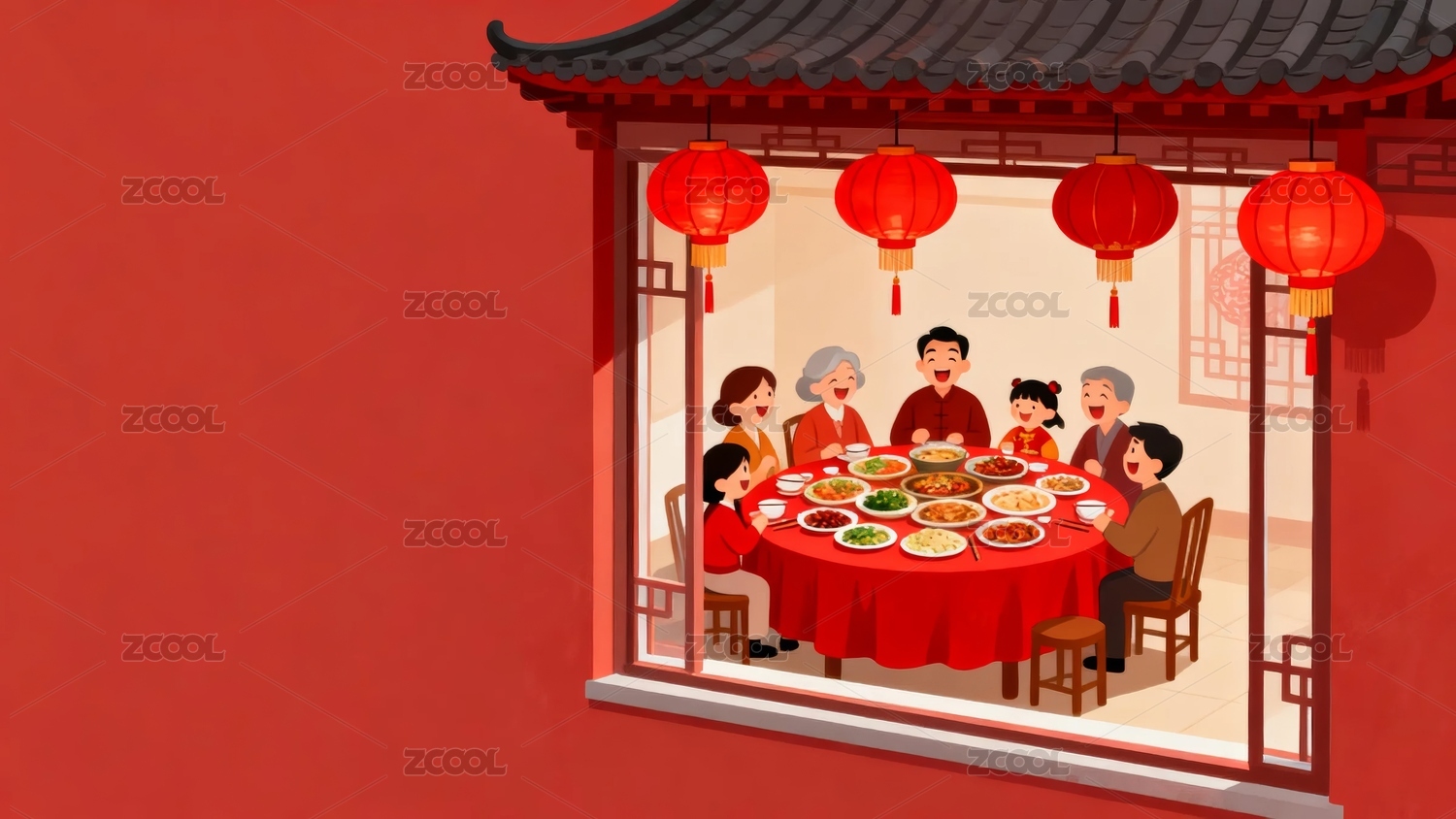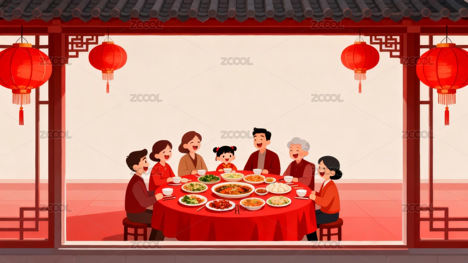 大年三十团圆饭年俗插画横版
