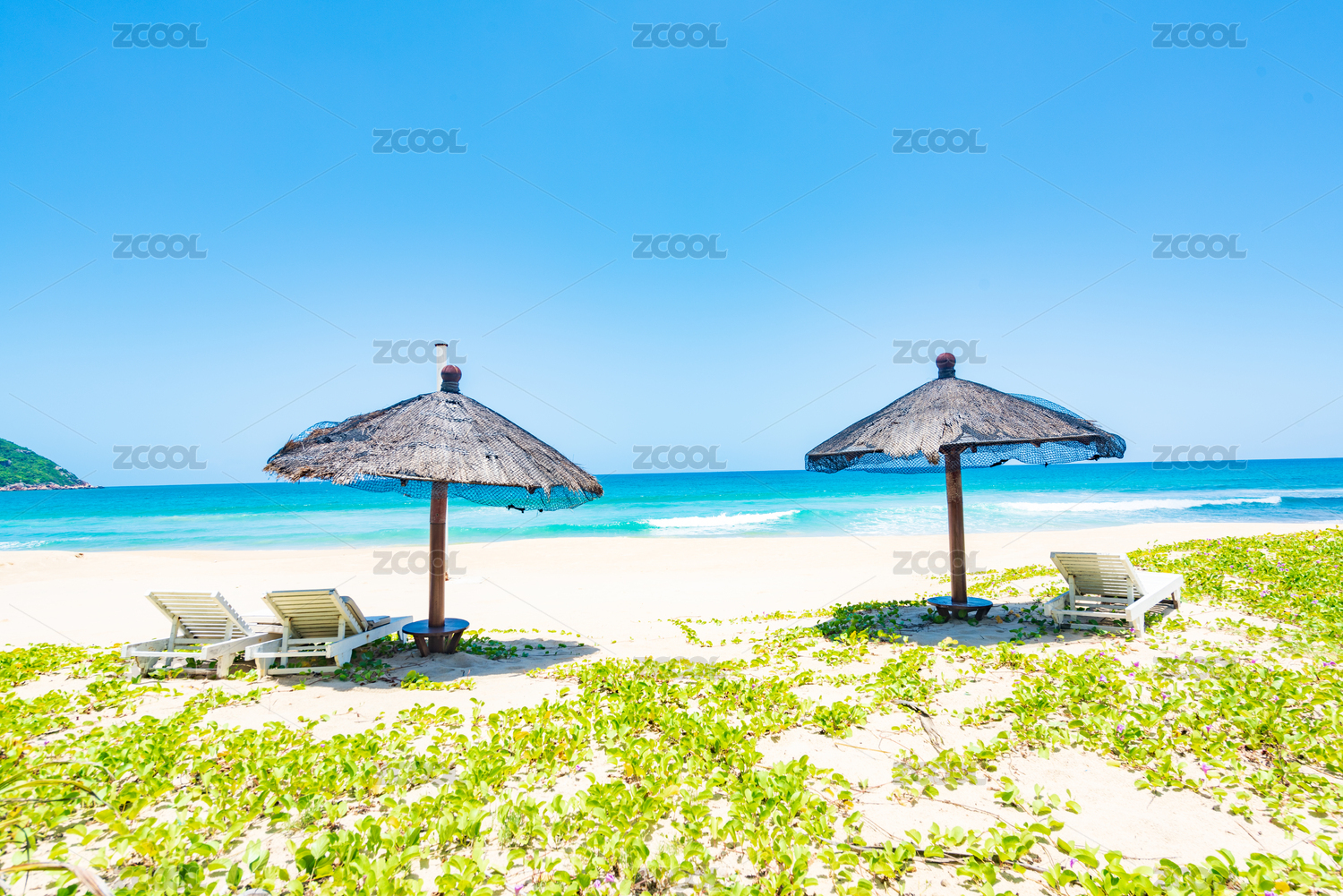 中国深圳大鹏东冲海岸边的休闲观景桌椅和遮阳伞