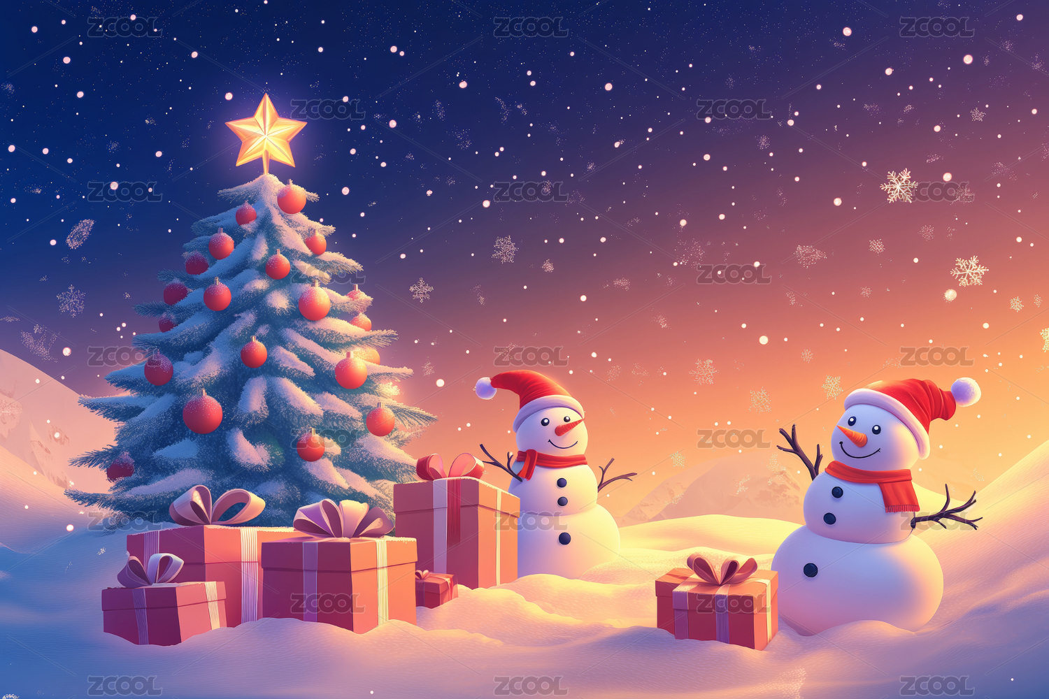圣诞树前雪人和礼物