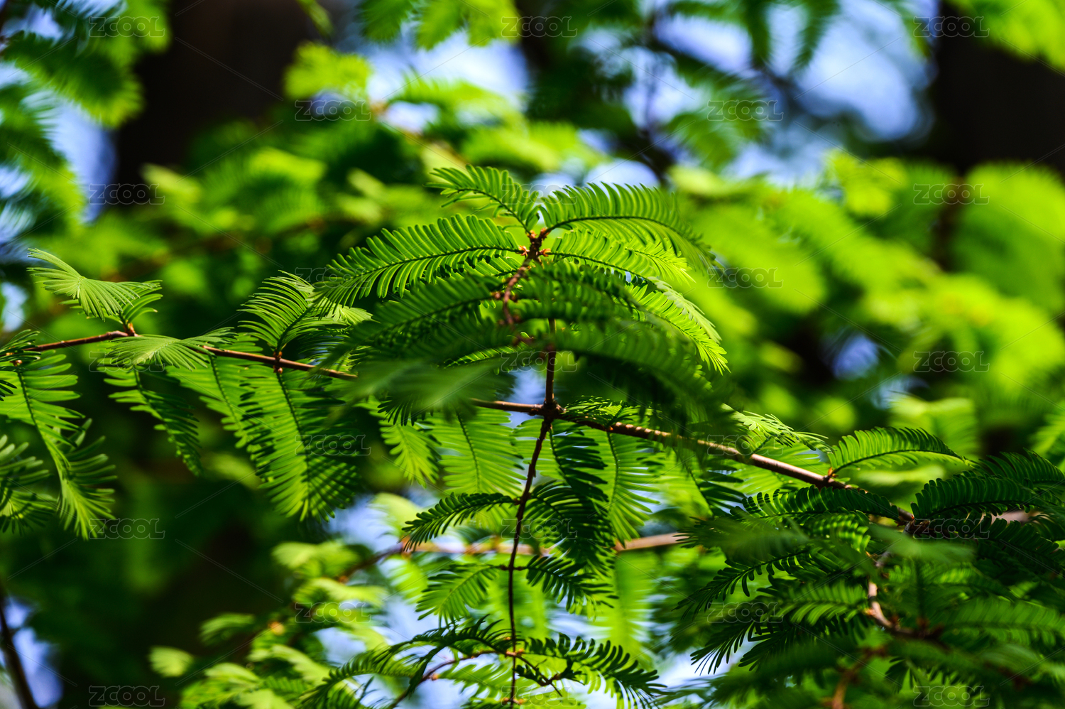 夏天阳光下的水杉绿叶子