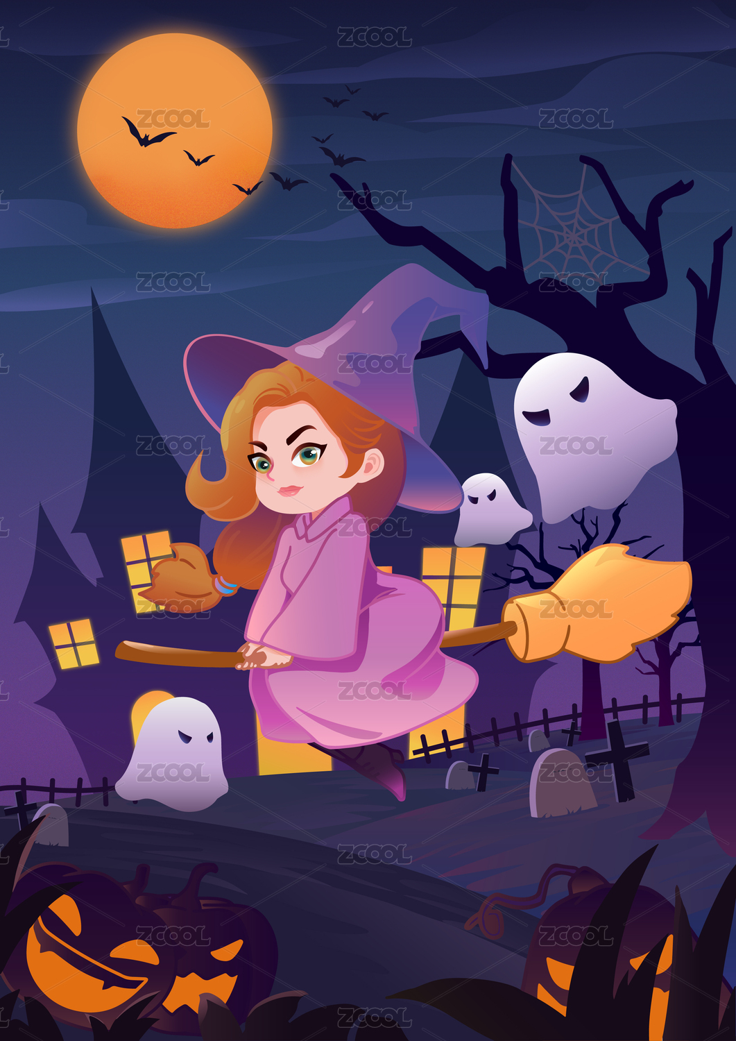 万圣节小女巫骑着草扫帚飞行西方传统节日