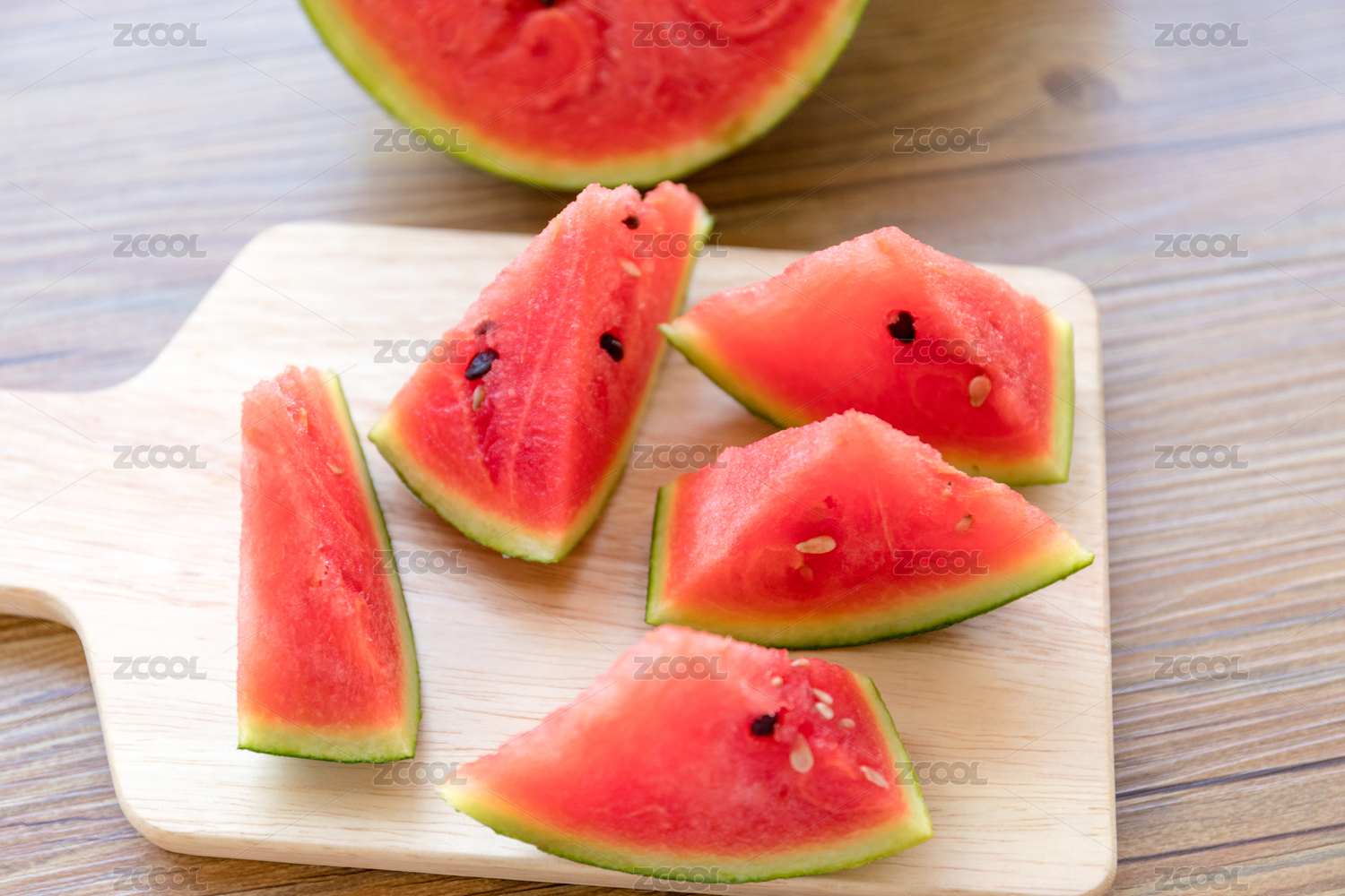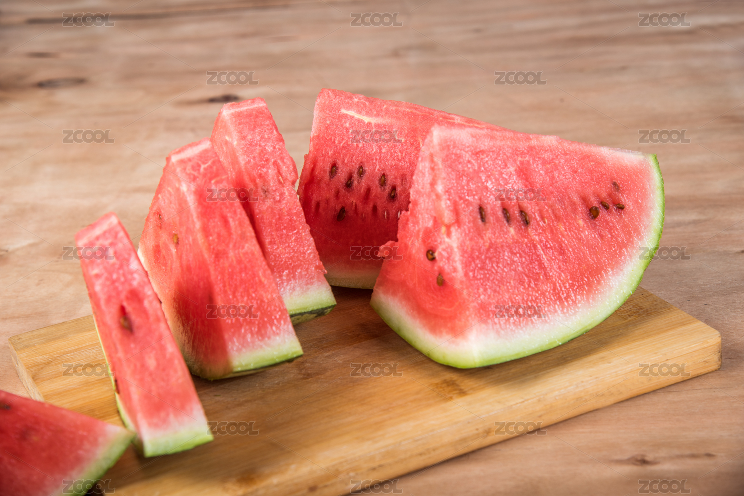 木制板上几片切好的红色西瓜