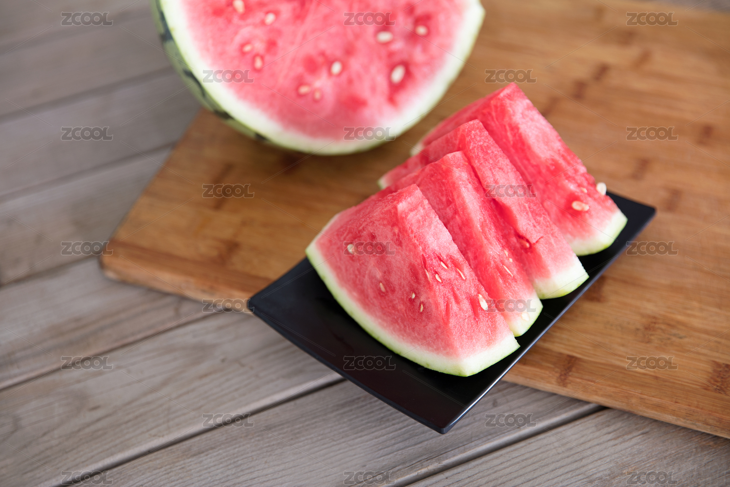 木板背景上放着几片红色的西瓜