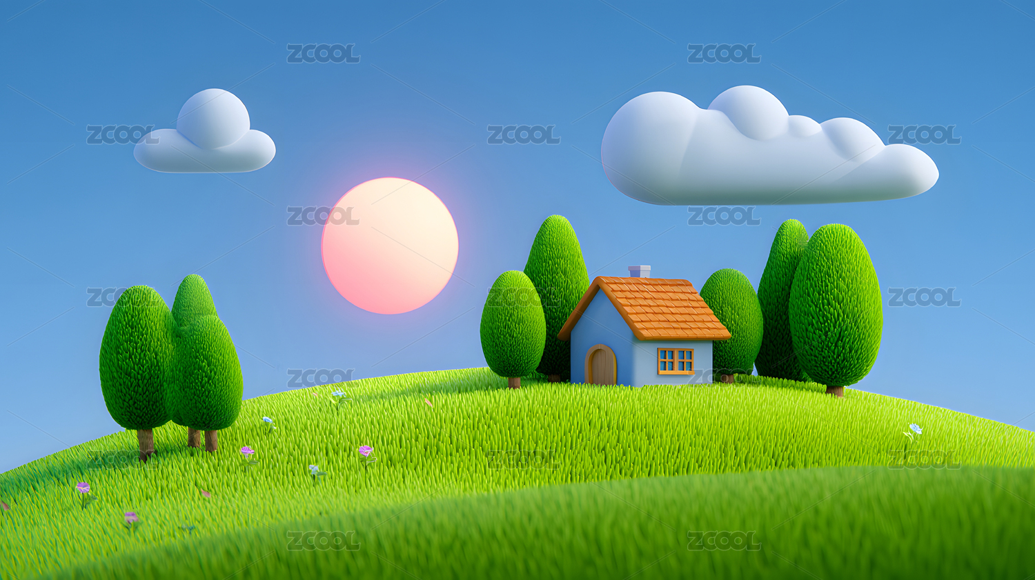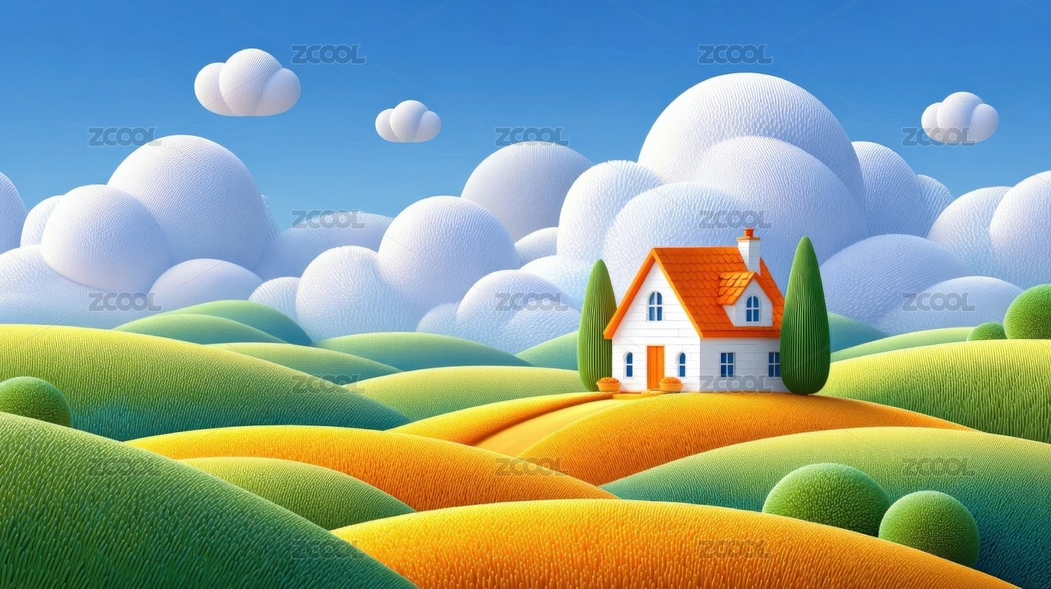 云朵,小屋,热气球,粉色,蓝色,绿色,天空,梦幻,卡通,可爱