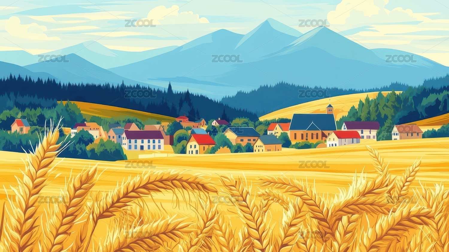 金色麦田与山峦村庄