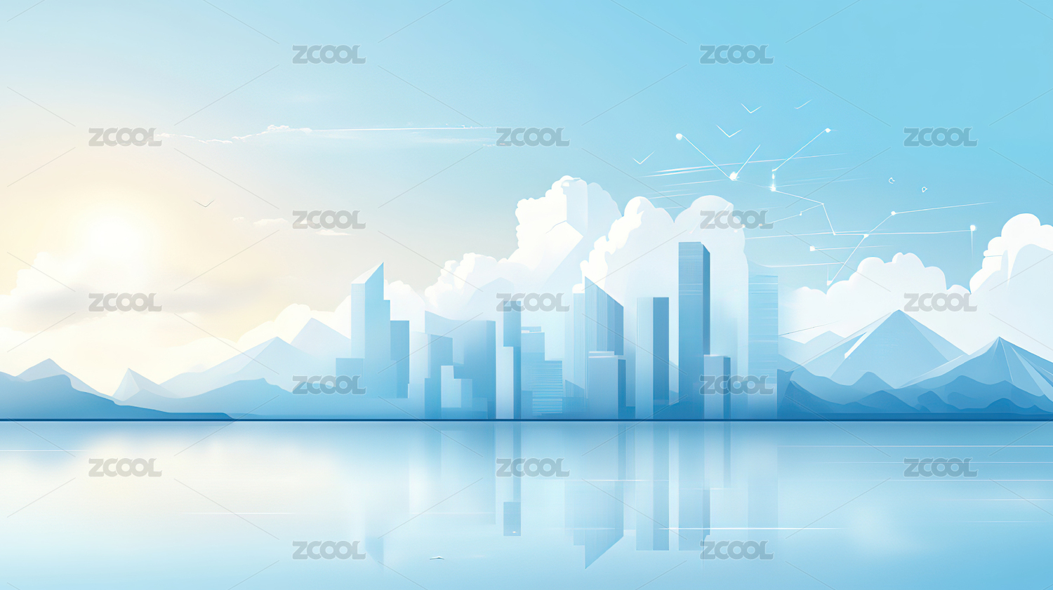 云和水之上的城市天际线插画背景